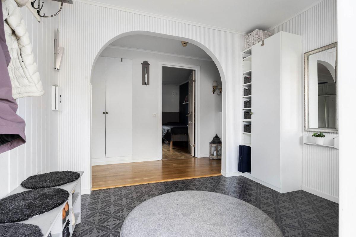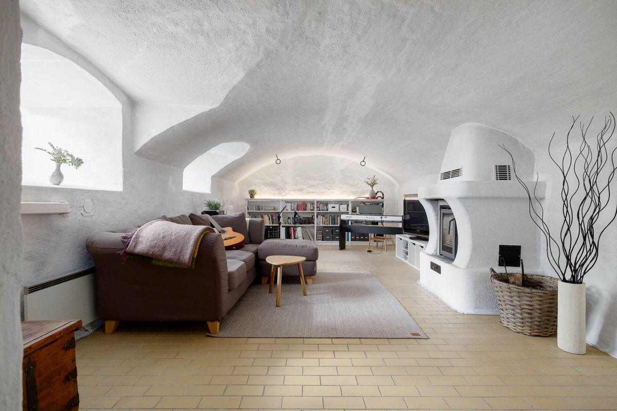 Invändigt bjuder bostaden på tidstypiska detaljer och genuin charm. Här finns vackra valv, gedigna väggar och en stämningsfull eldstad som sprider värme under årets kallare månader. Den smarta planlösningen i souterrängplanet skapar både rymd och trivsel – ett hem med själ och karaktär.