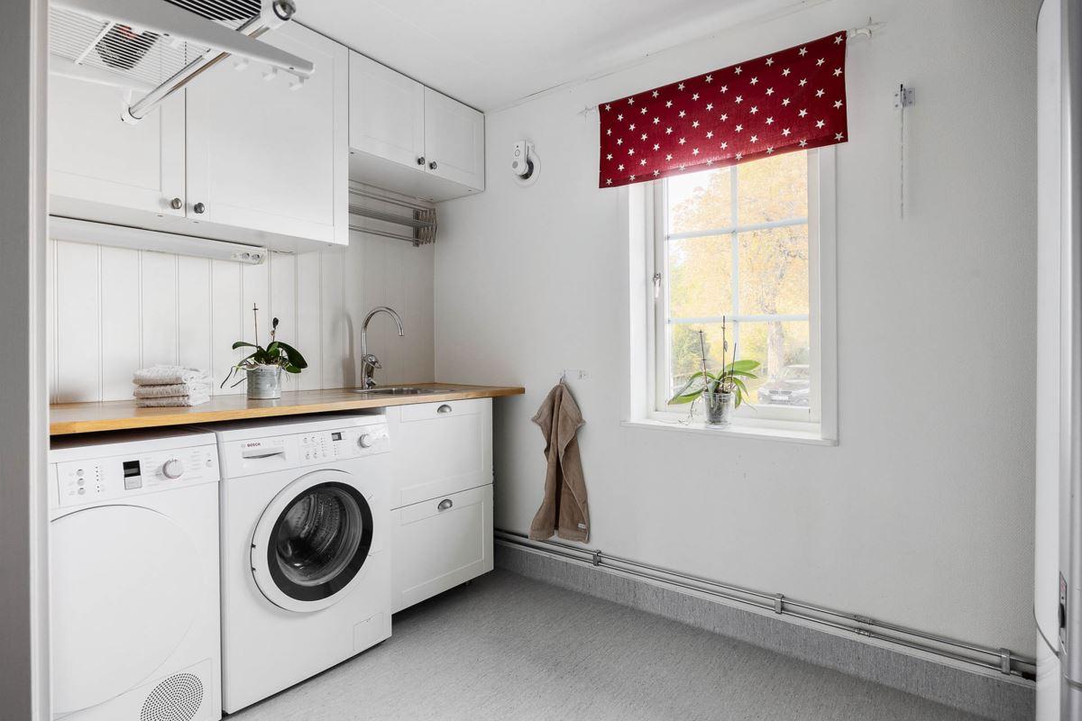 • TvättstugaVäggar med väv och våtrumsmatta med golvvärme. Utrustning: Tvättmaskin, torktumlare tvättho. Renoverat 2014