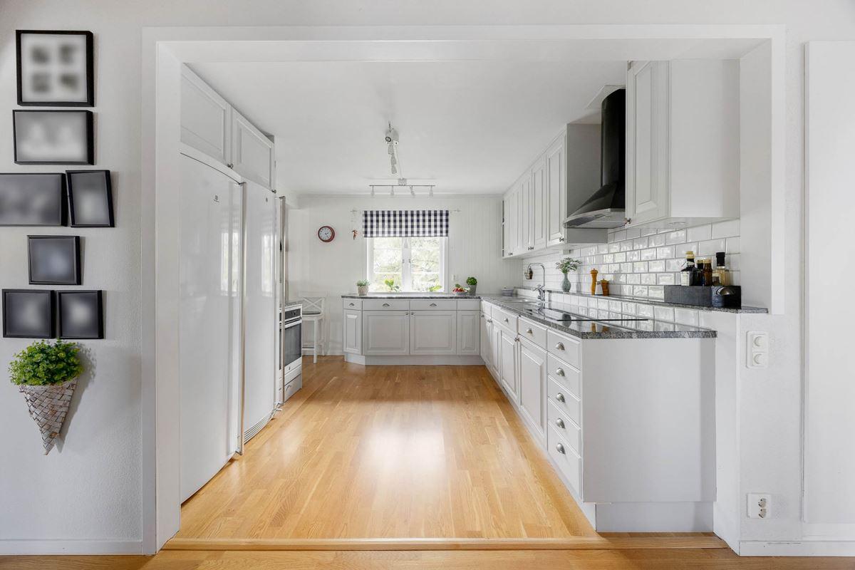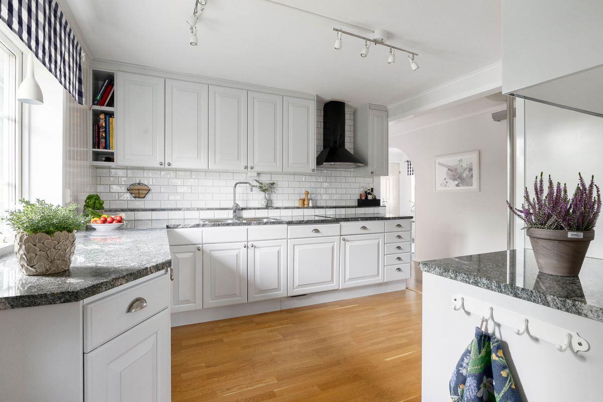 • KökKök från Ballingslöv med vita köksluckor och bänkskivor av italiensk granit och vitt kakel ovanför. Ekparkett med golvvärme. Utrustning: Kyl, frys-23, spishäll, fläkt, diskmaskin samt mikro. Samtliga av märket Elektrolux. Renoverat 2014