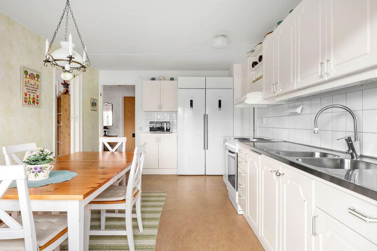- KökKök med linoleummatta på golvet. Utrustning : spis, spisfläkt, kylskåp och frys.