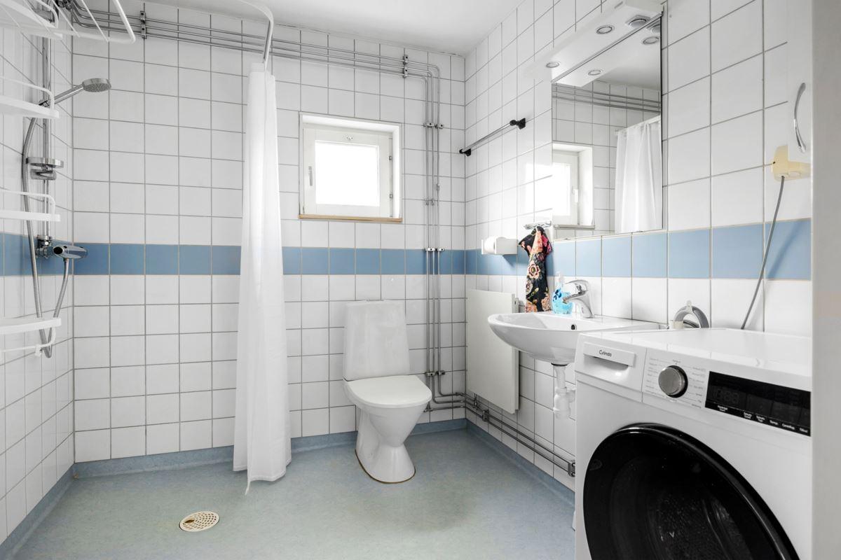 - DuschrumDuschrum med våtrumsmatta på golvet och kakel på väggarna. Utrustning dusch med duschväggar, toalett, handfat och tvättmaskin.