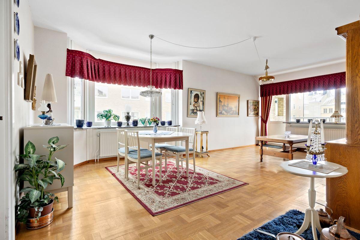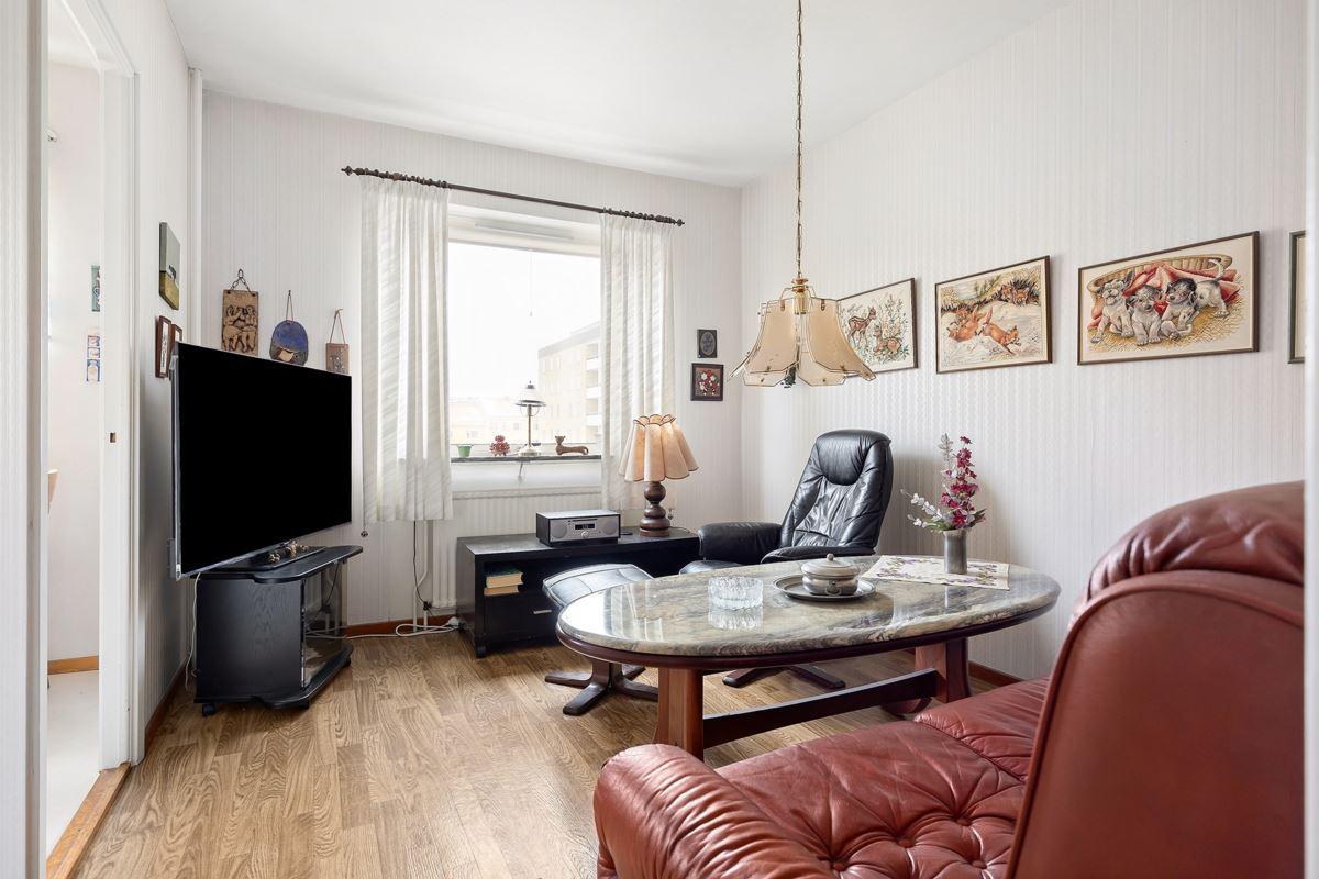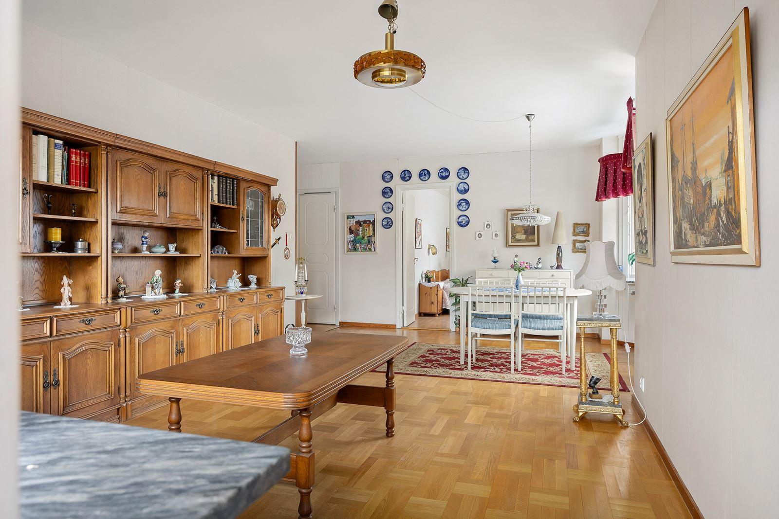 - Vardagsrum med burspråkStavparkett med utgång till inglasad balkong