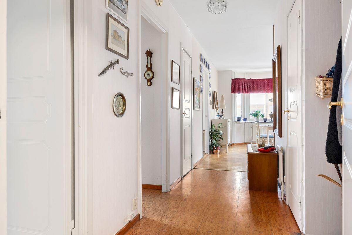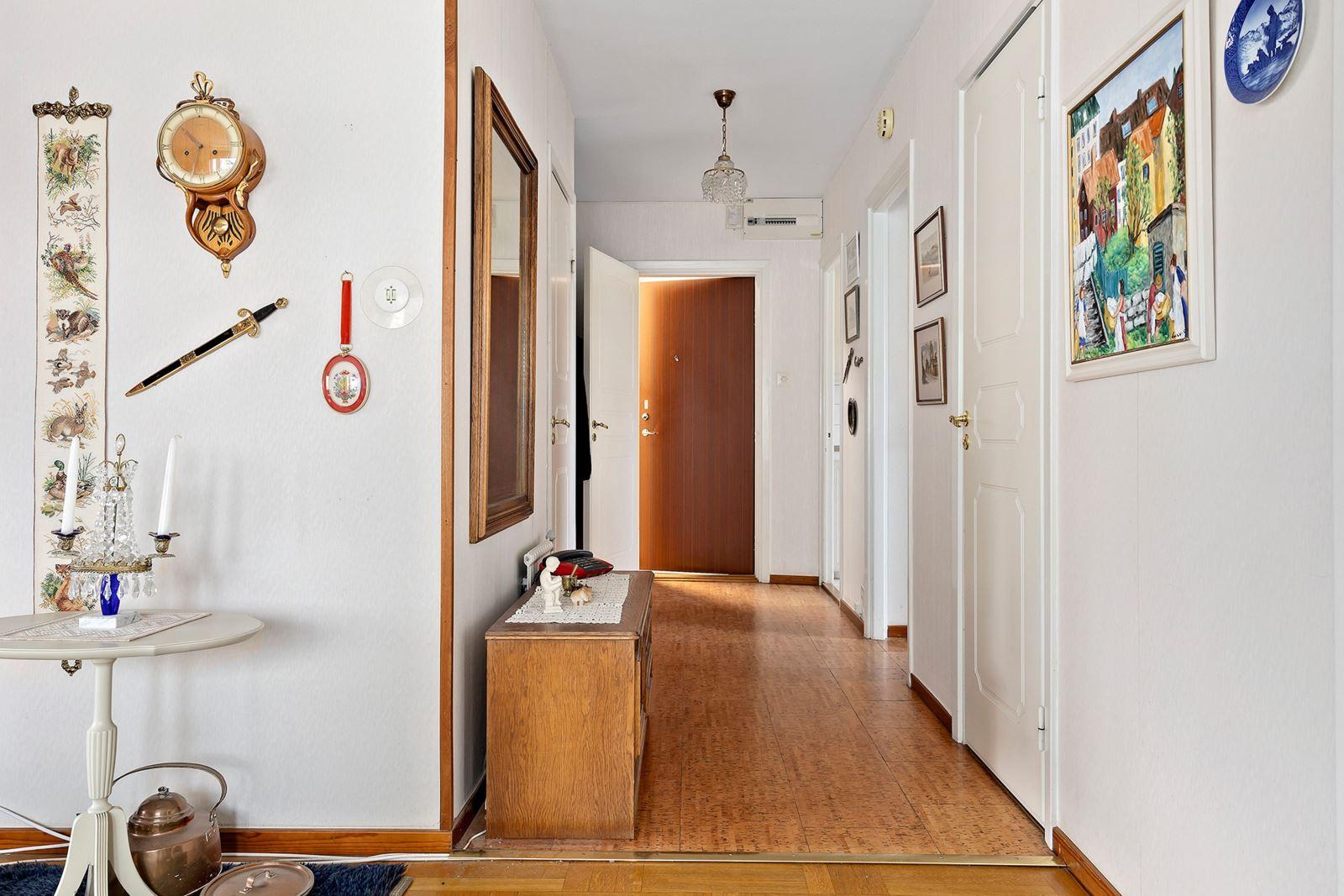 - Hall med avhägningsdelKorkoplastmatta på golv. I anslutning till hallen finns en klädkammare.