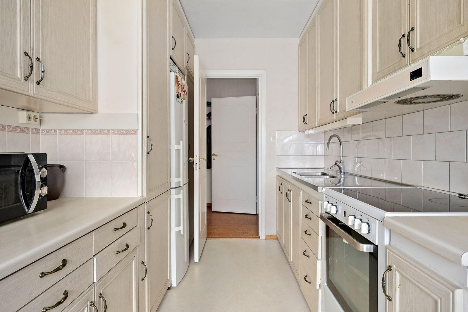 - Kök med matplatsKorkoplastmatta på golv med äldre köksinredning. Utrustning: Kyl/frys, spishäll med ugn, fläkt och micro.