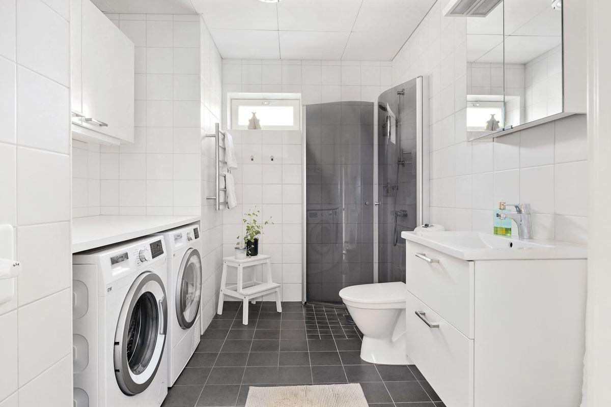 • BadrumBadrum med kaklade väggar och klinkers på golvet, med vattenburen golvvärme. Utrustat med toalett, kommod, dusch, handukstork, tvättmaskin samt torktumlare.