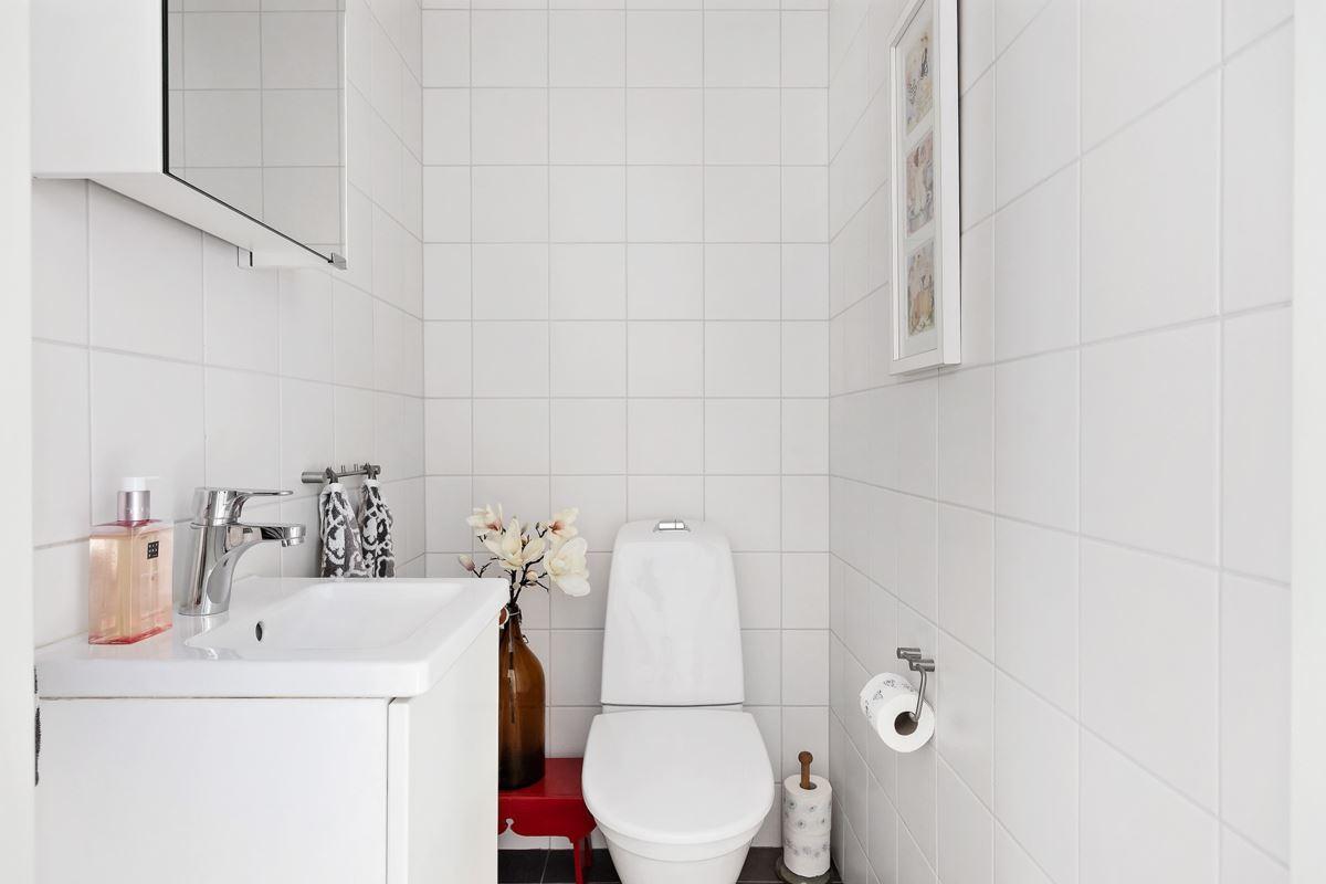 • GästtoalettGästtoalett med kaklade väggar och klinkers på golvet. Utrustat med toalett, handfat med kommod och spegelskåp.