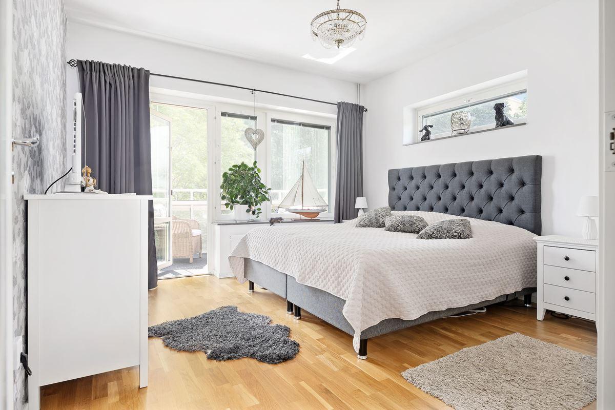 • Sovrum 2Sovrum med parkettgolv, målade väggar och fondvägg med tapet. Två garderober och utgång till den inglasade balkongen.