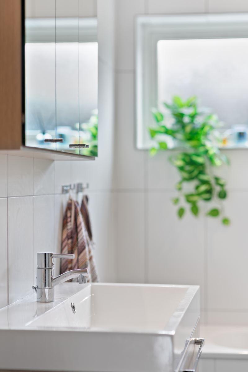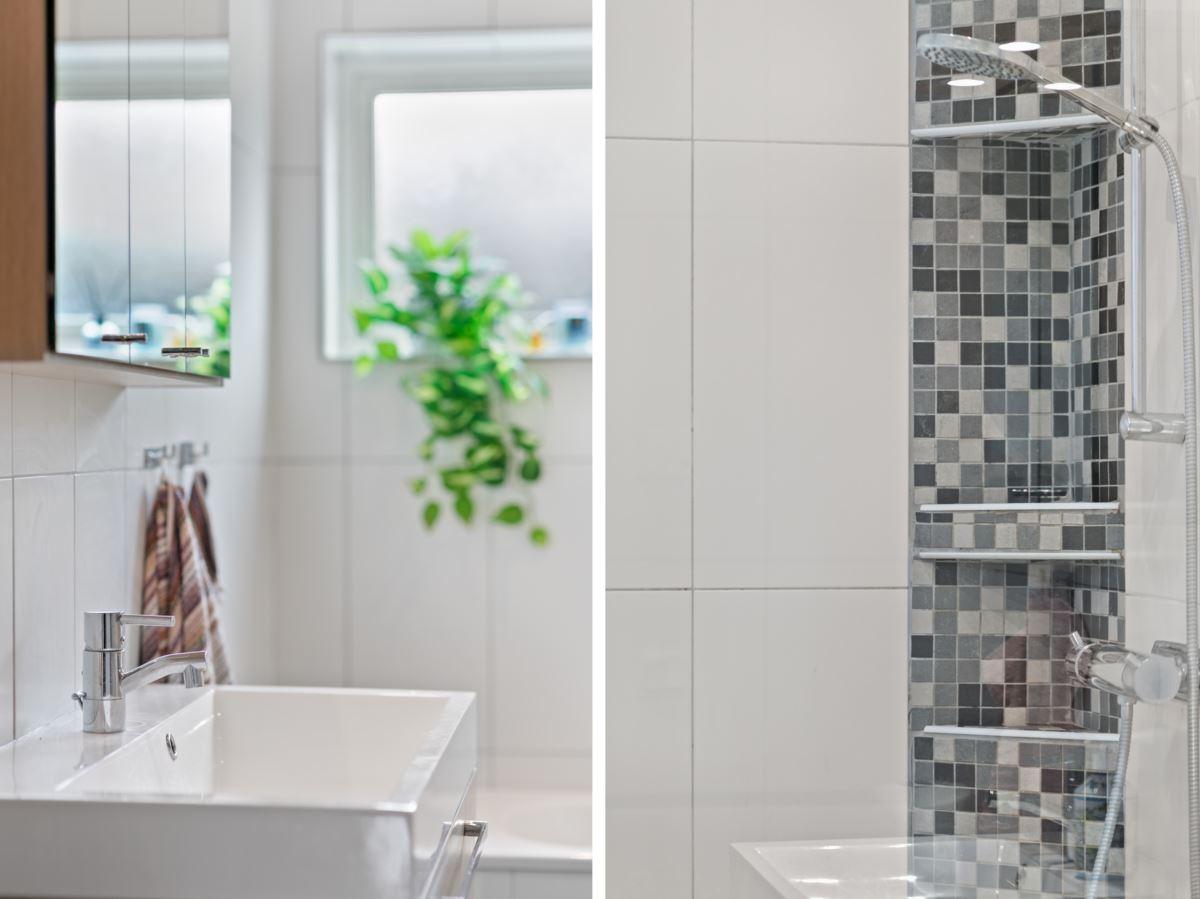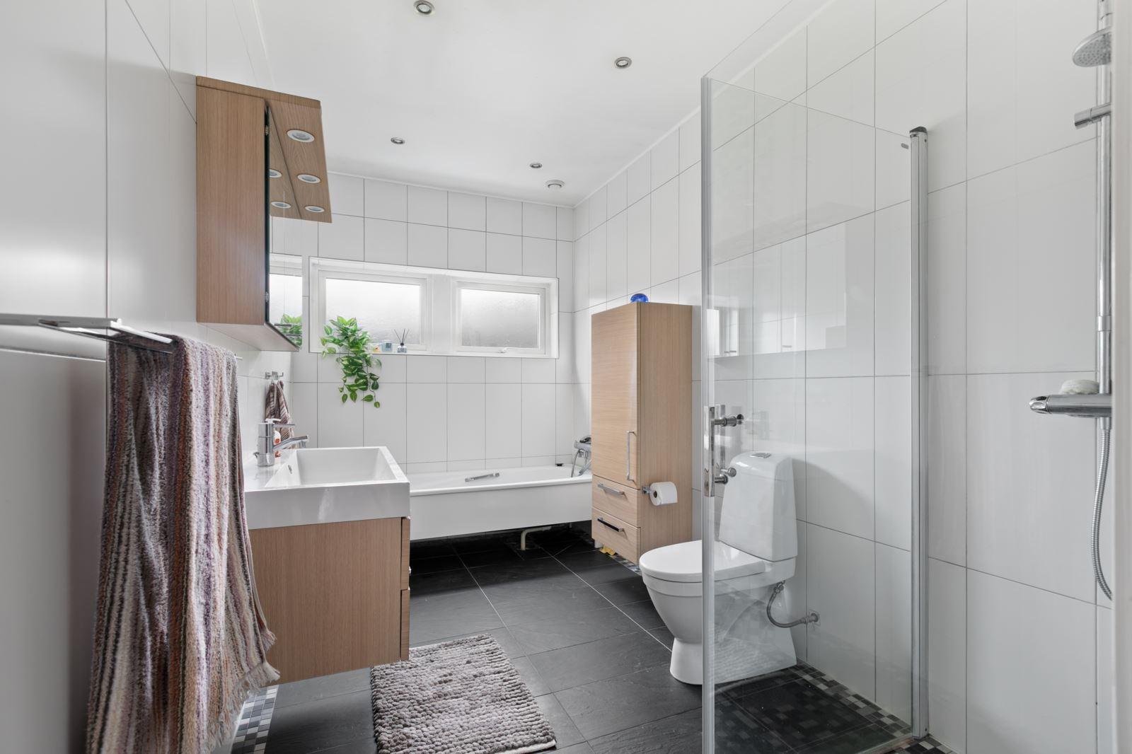 • Badrum med bad och duschKlinker på golv med golvvärme och kakel. Utrustning: Toalett, badkar, dusch, commod, badrumsspegel, badrumsskåp (Hafa) samt spotlights i tak