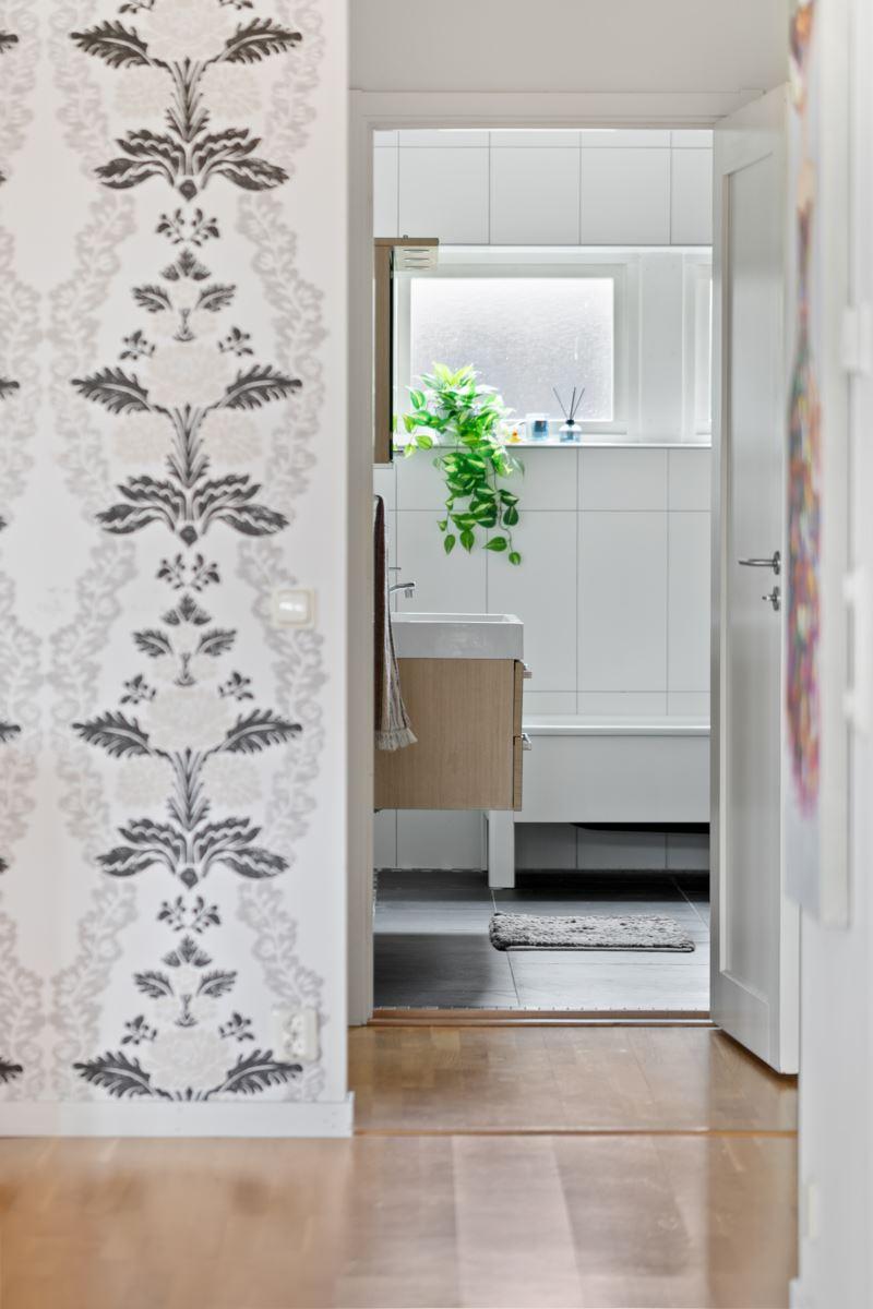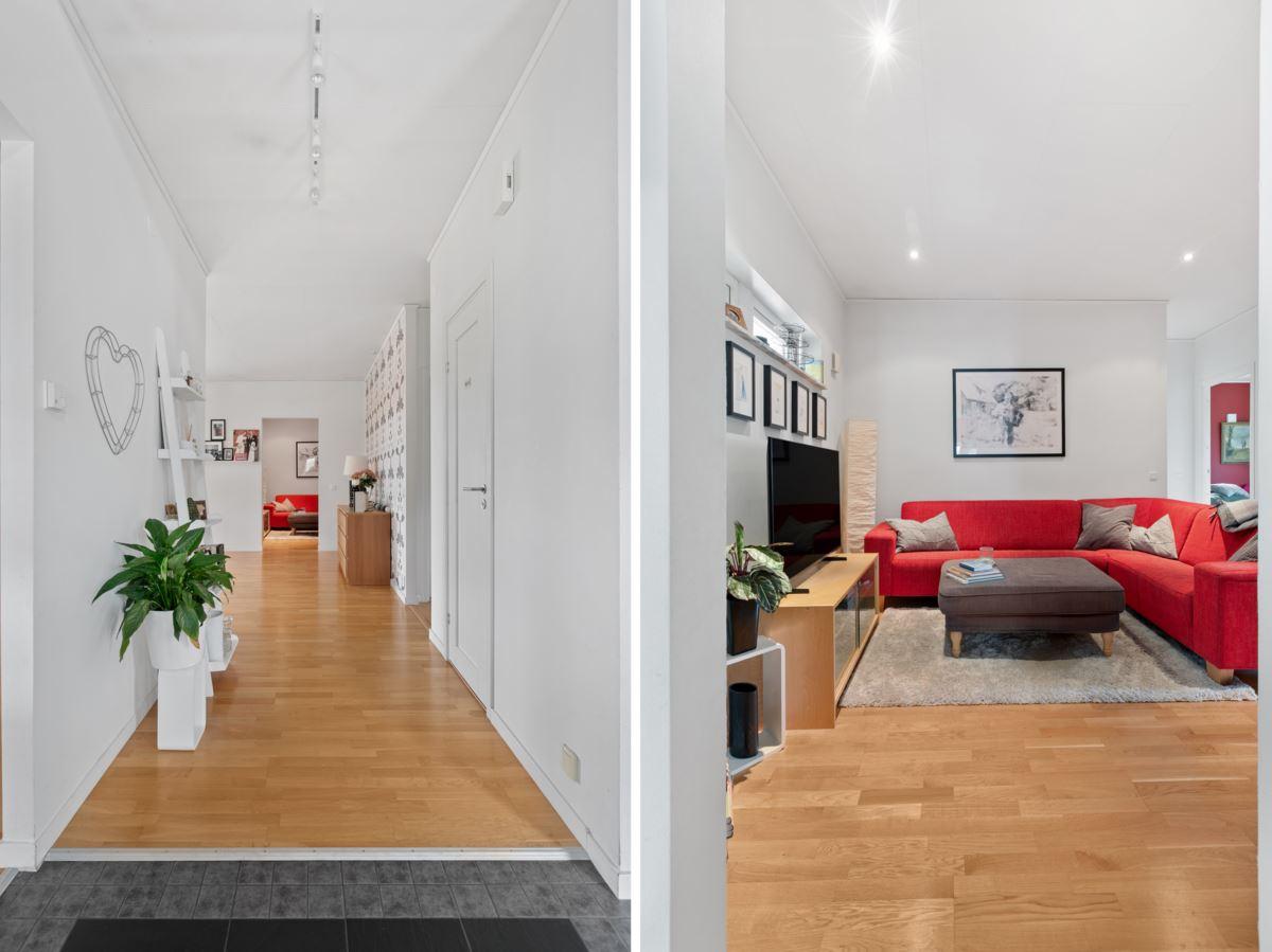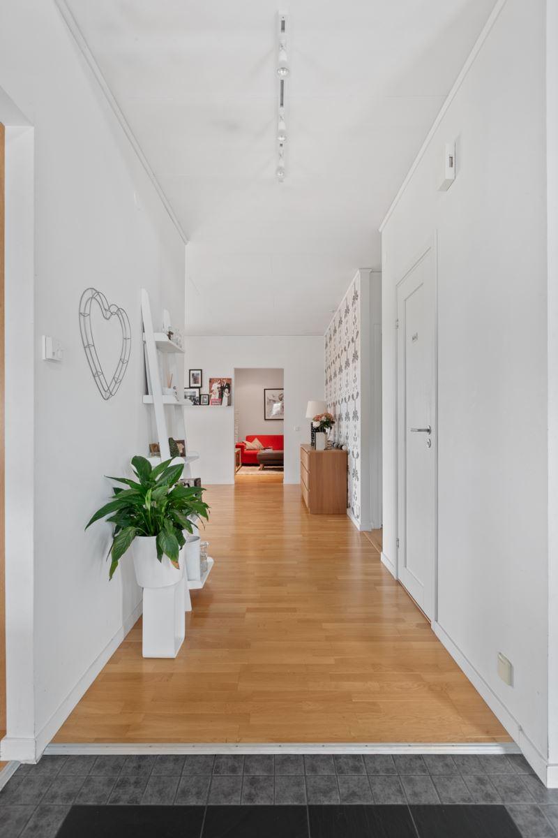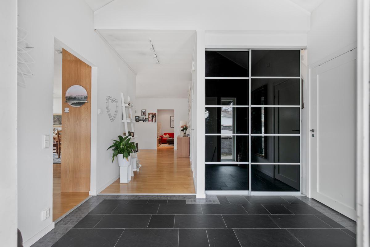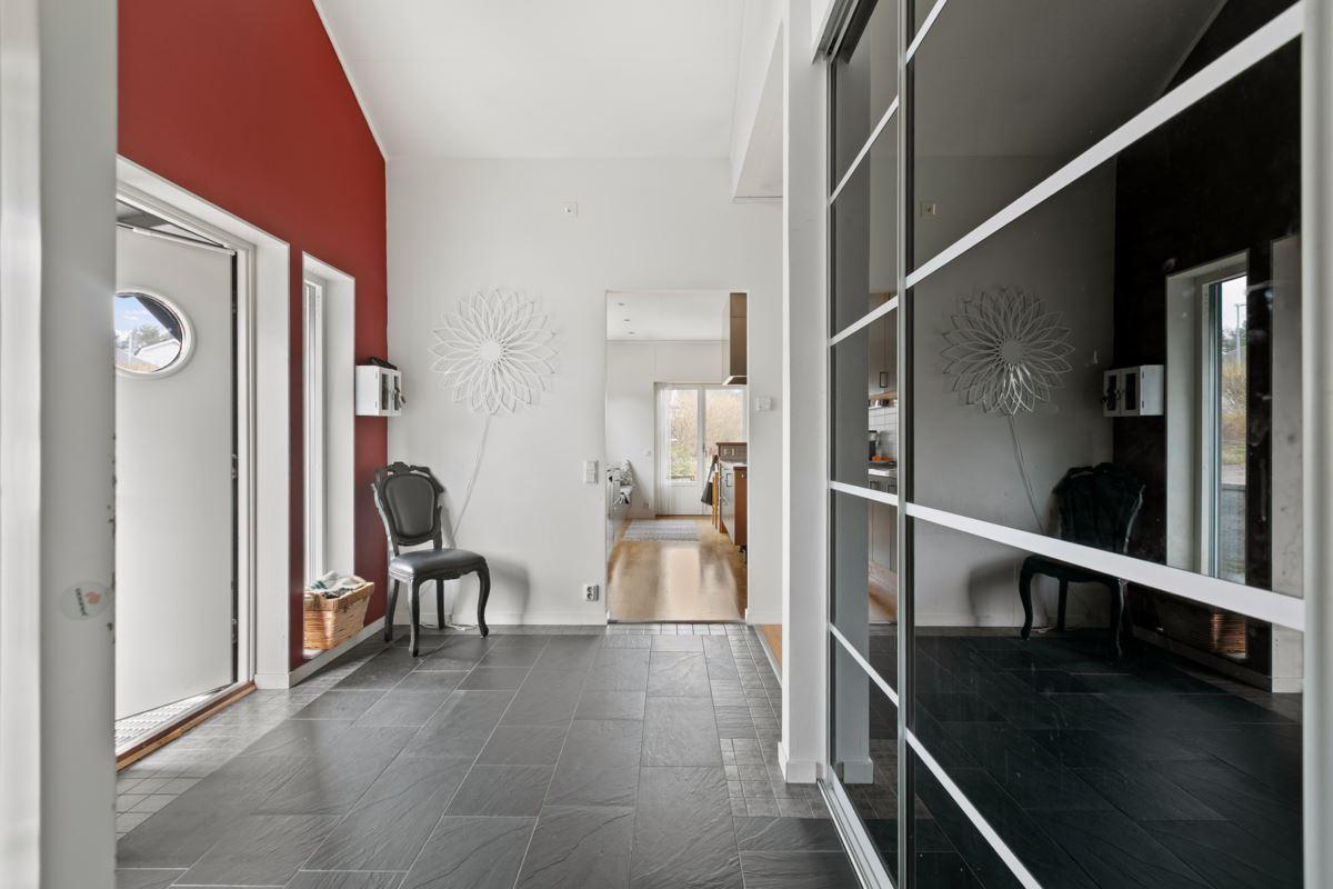 • Rymlig hall med ryggås tak och avhägningKlinkergolv och skjutbar garderobsvägg