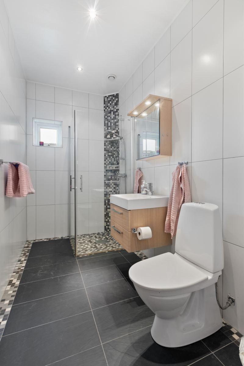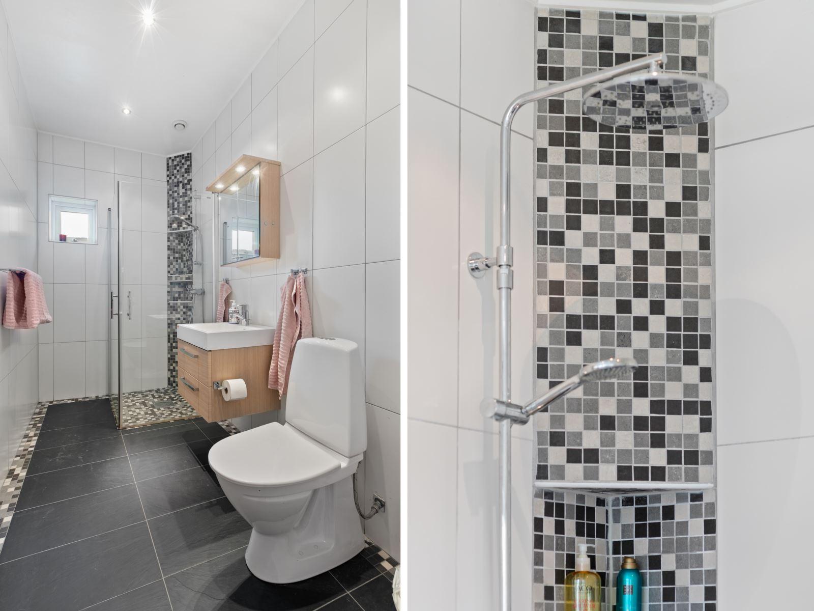 • DuschrumKlinker på golv med golvvärme och kakel. Utrustning: Toalett, dusch, commod, badrumsspegel (Hafa) samt spotlights i tak