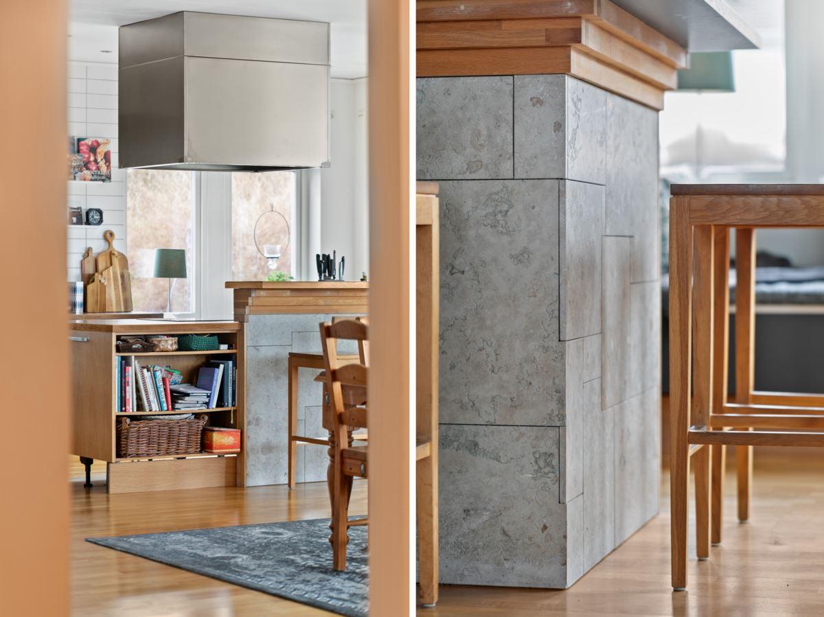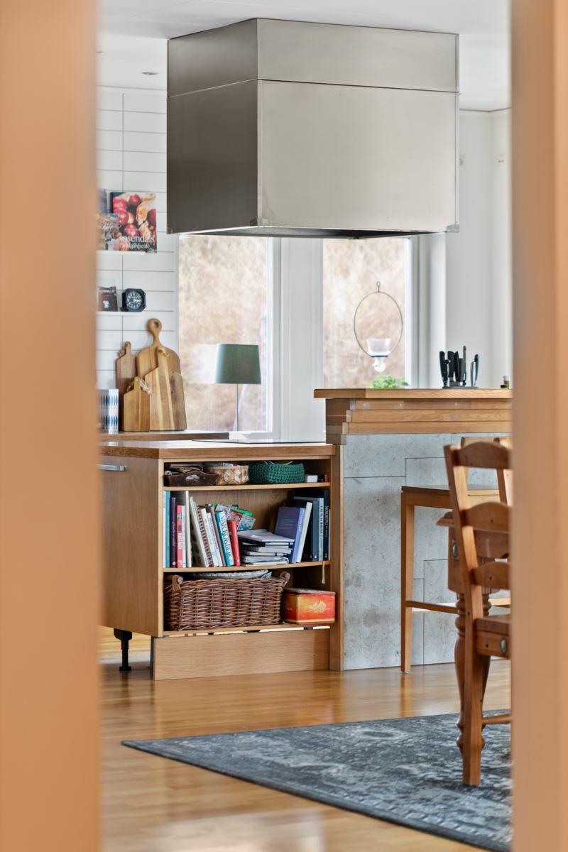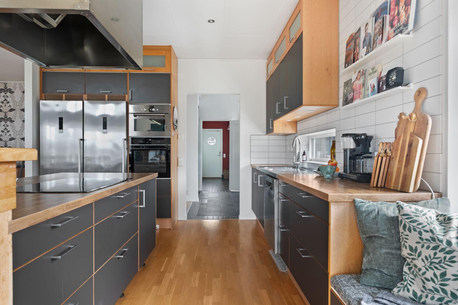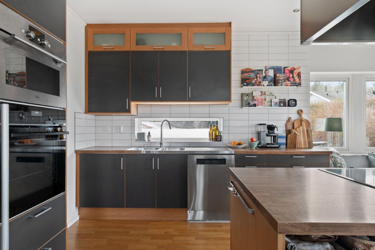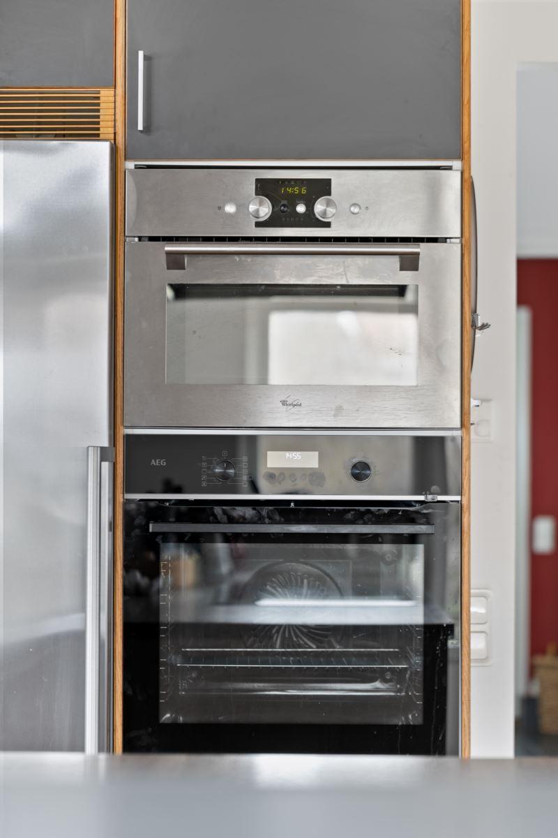 • Kök med köksö samt separat matplatsEkparkett, gråa köksluckor från Marbodal. Utrustning: Kyl, frys (båda från Siemens), varmluftsugn (AEG), spishäll med induktion (Samsung), egen fläkt anordning som är vältilltagen, diskmaskin (Grundig), mikro med dubbelfunktion (Whirpool). Skafferi/förråd i anslutning till köket.