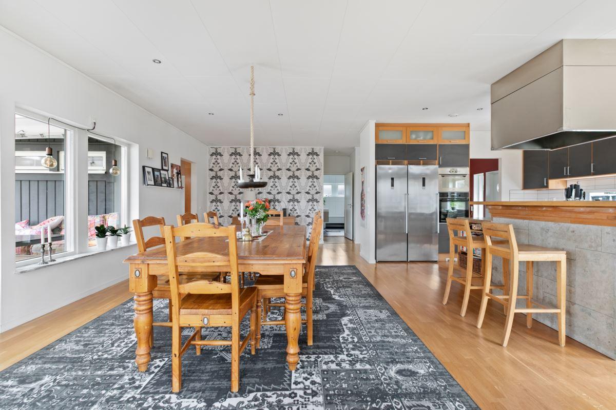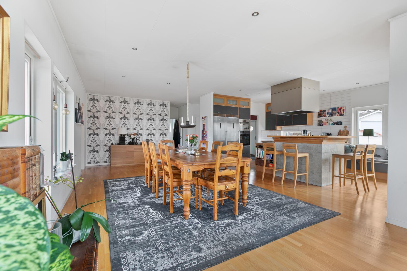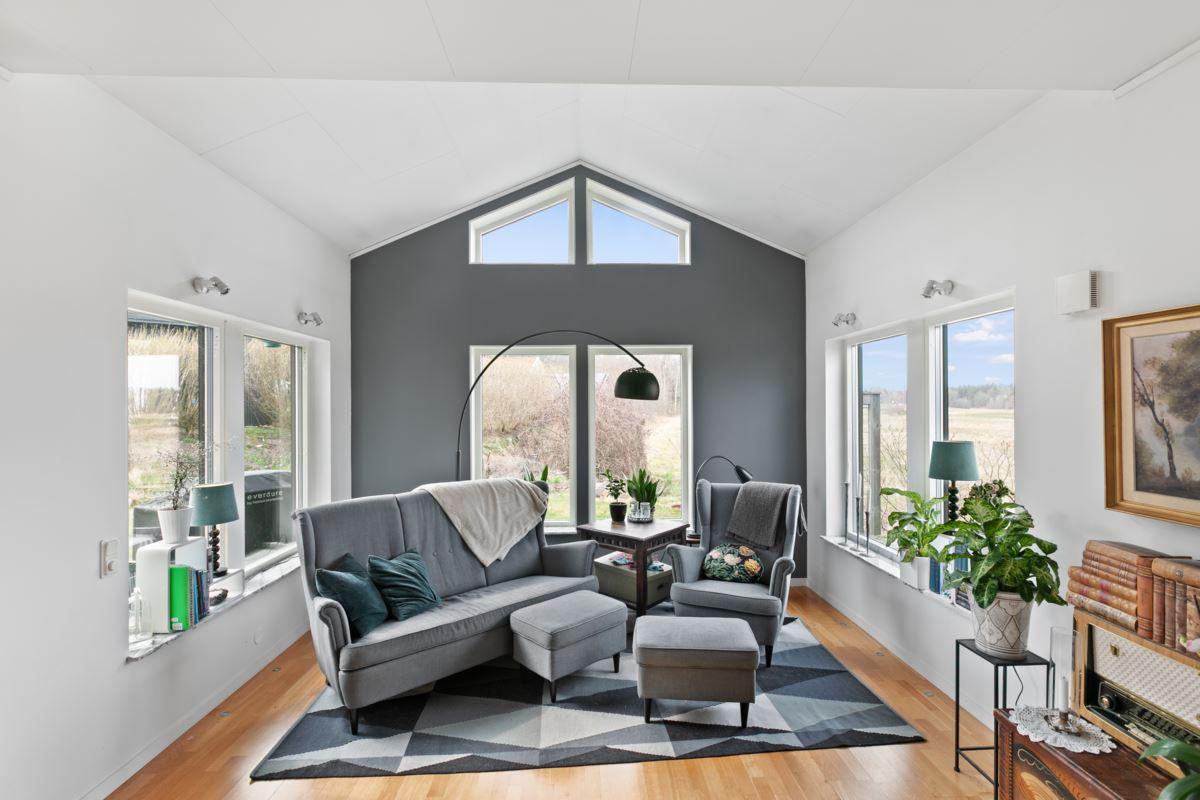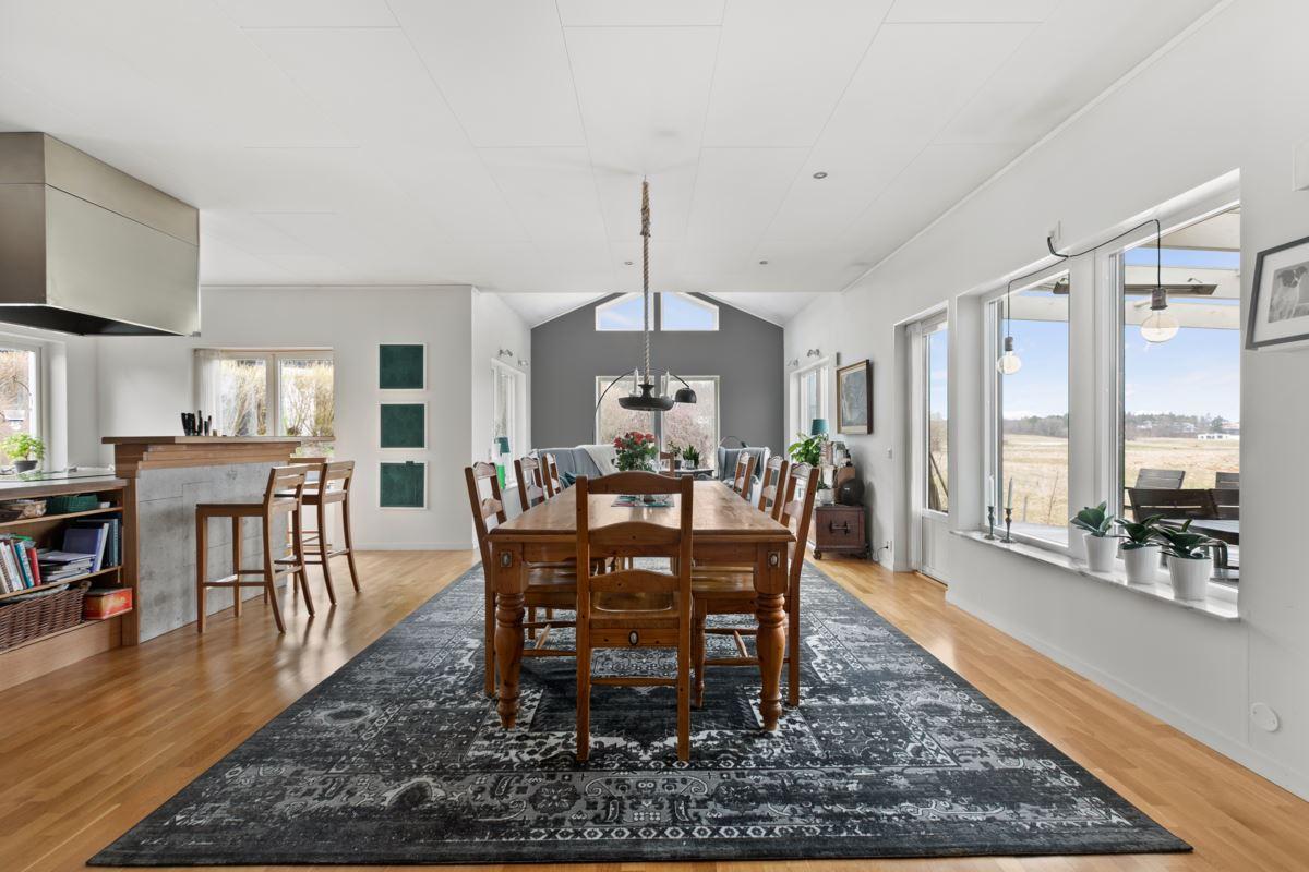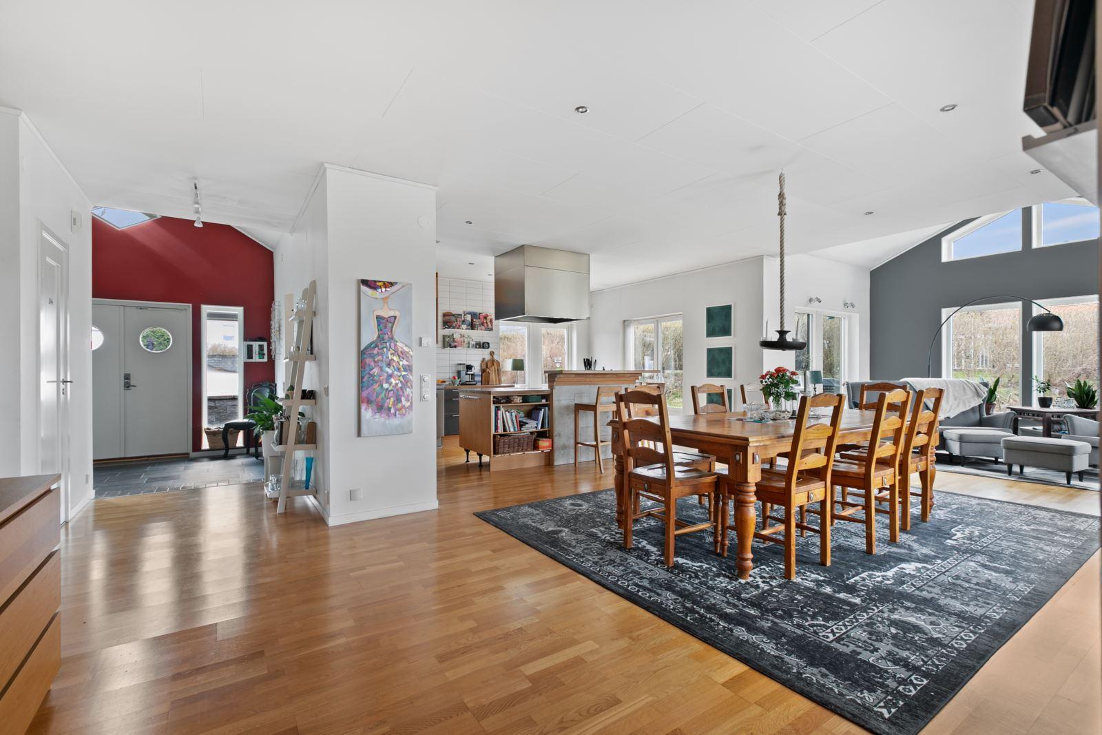 Denna fantastiska enplansvilla bjuder på en öppen och inbjudande planlösning där varje kvadratmeter är genomtänkt. De imponerande ryggåstaken och den generösa takhöjden skapar en härlig känsla av rymd och ljusinsläpp som genomsyrar hela bostaden.