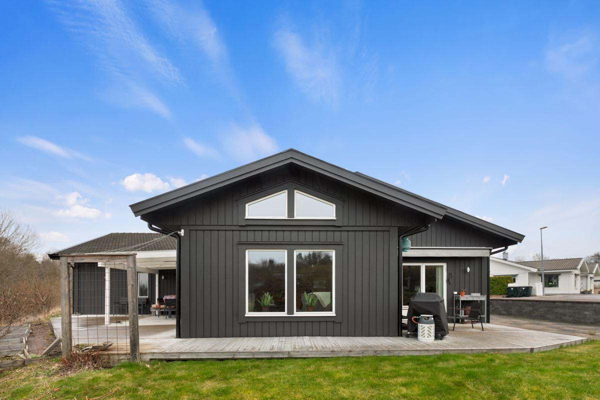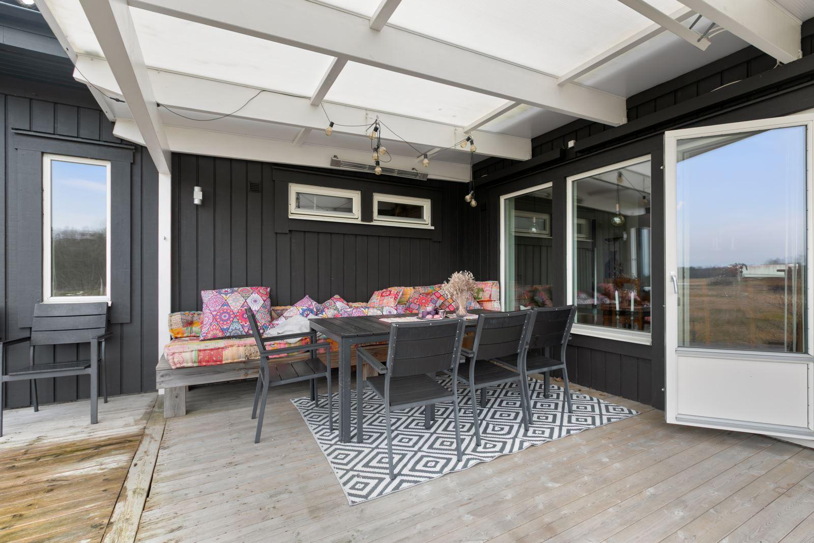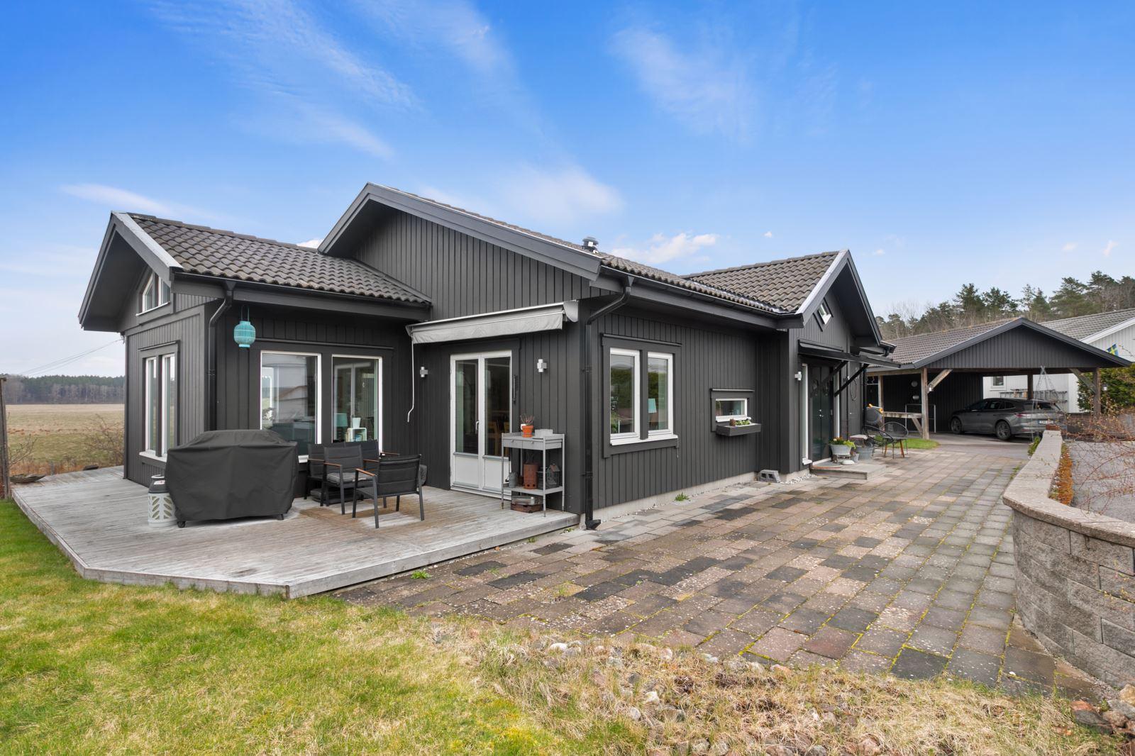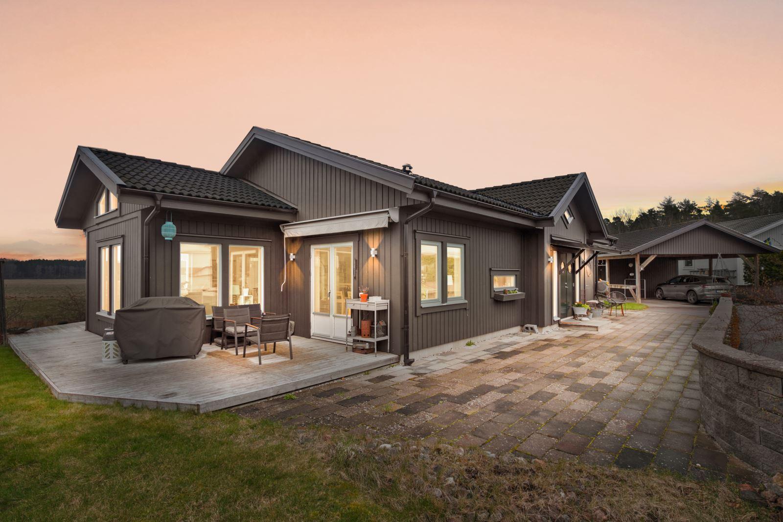 Utomhus väntar ett stort, härligt trädäck i bästa läge med eftermiddags- och kvällssol – en given plats för middagar, avkoppling och sommarens alla stunder.