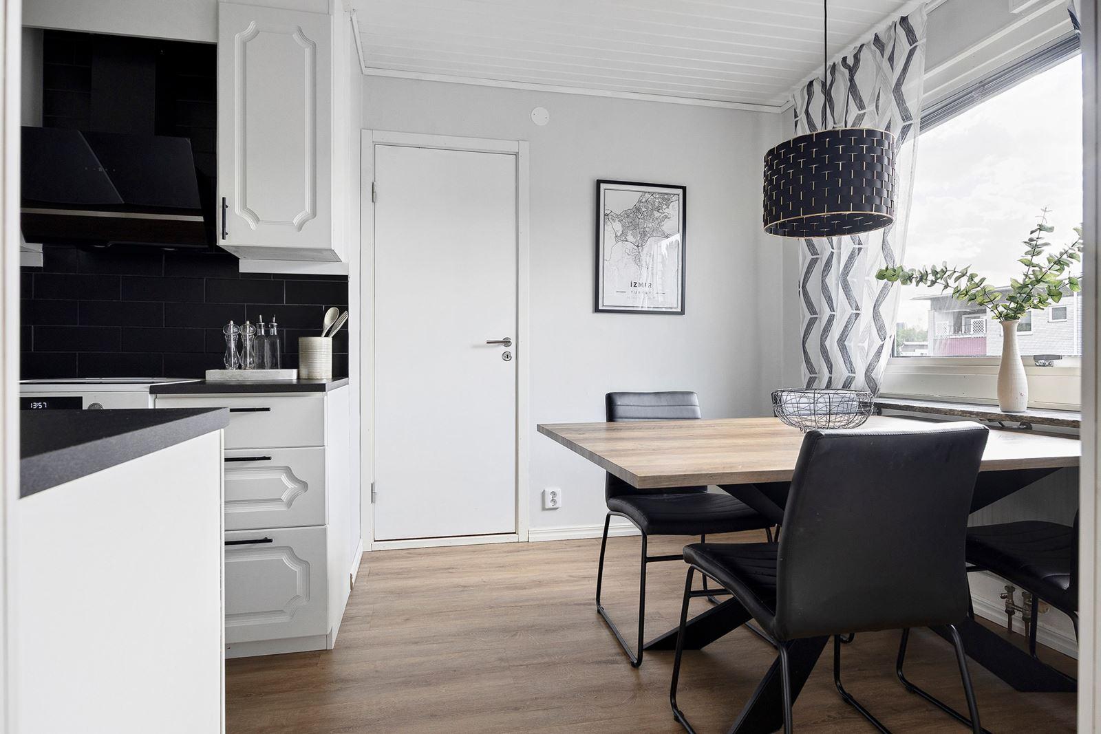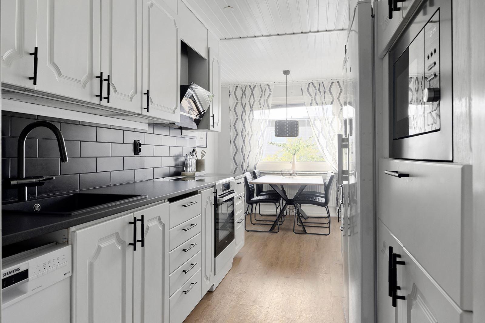 • Kök med matplatsLaminatgolv samt vita skåpsluckor. Utrustning: Kyl, frys, spishäll med ugn, fläkt, diskmaskin samt mikro