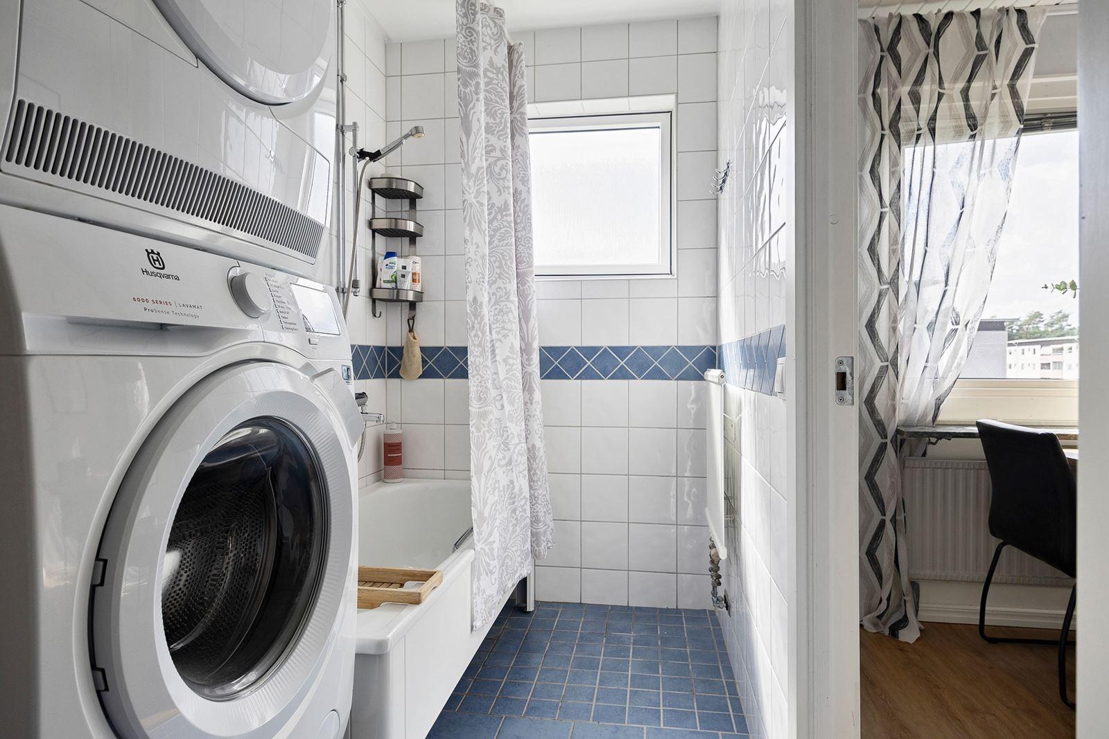 • Stort badrum med separat WcKakel och klinker på golv. Utrustning: Toalett, handfat i separata Wc. Badkar samt tvättmaskin och torktumlare