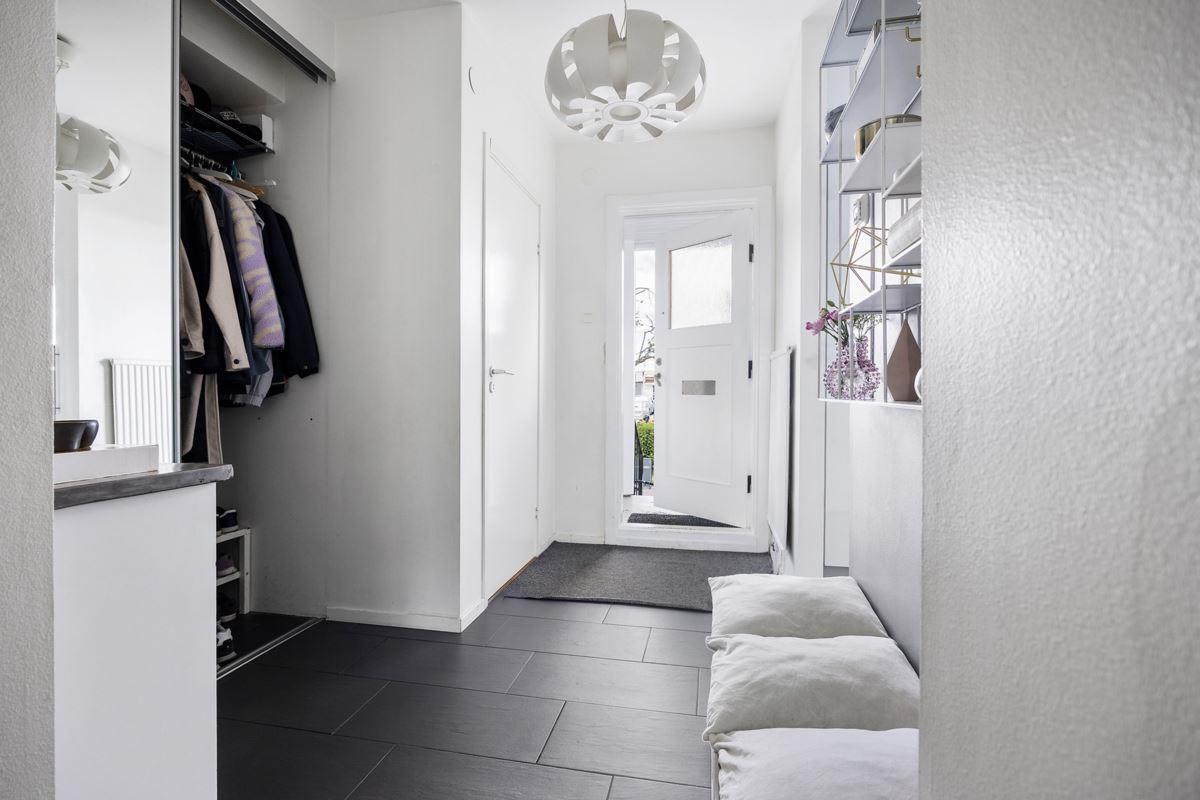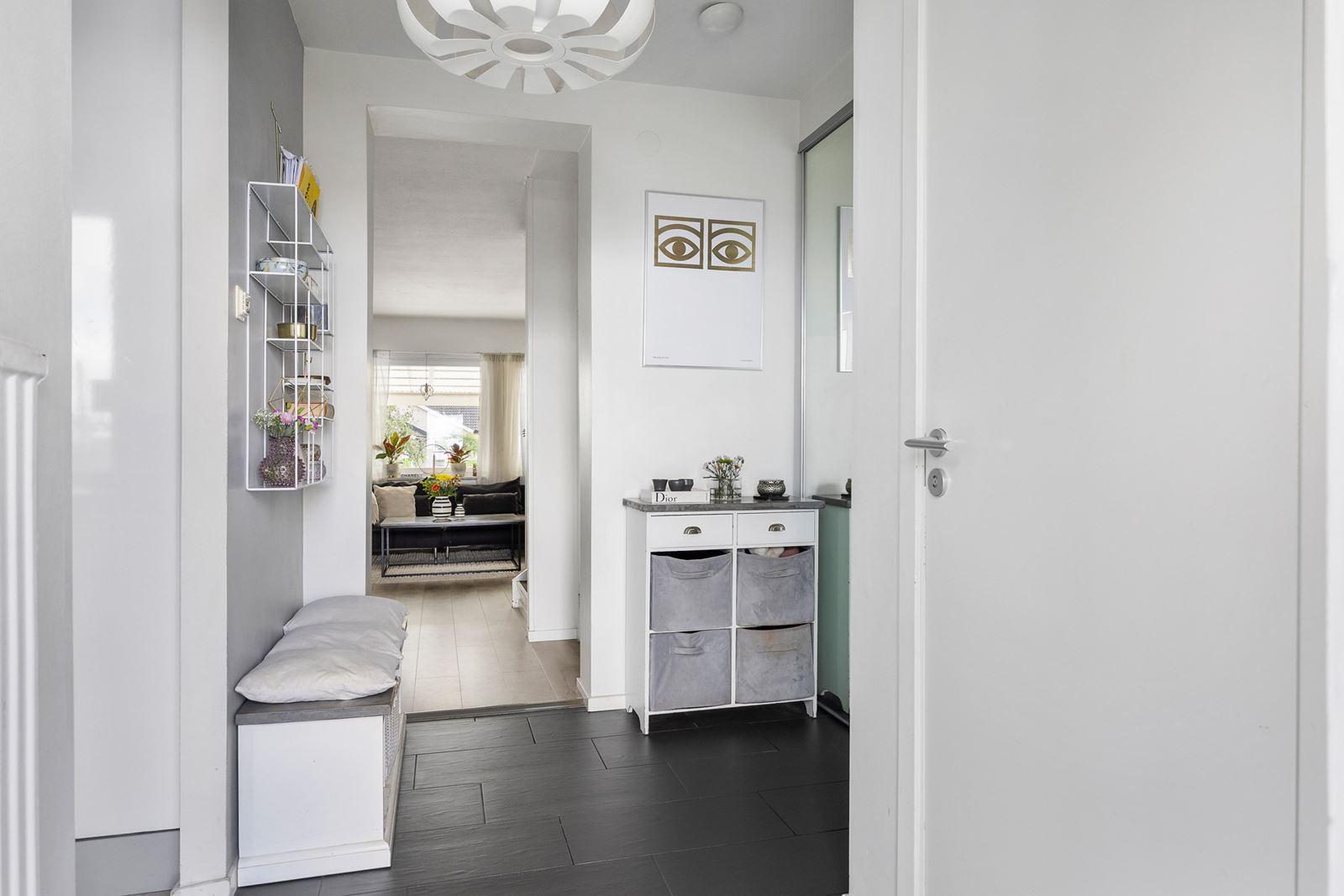 • Hall med avhägningdelsKlinkergolv med golvvärme samt skjutbara garderober med spegeldörrar och elfainredning