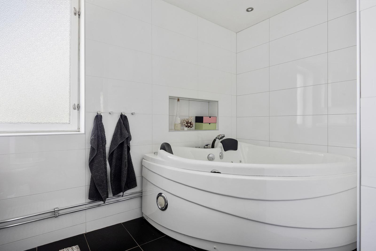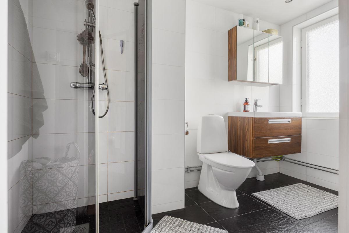 • Bad/duschrumKlinker med golvvärme (el), kakel, fondvägg, spotlights, bubbelbadkar (ej i funktion), wc, handfat med underskåp, spegelskåp, fönster, duschhörna, freshfläkt och infälld nisch i väggen.