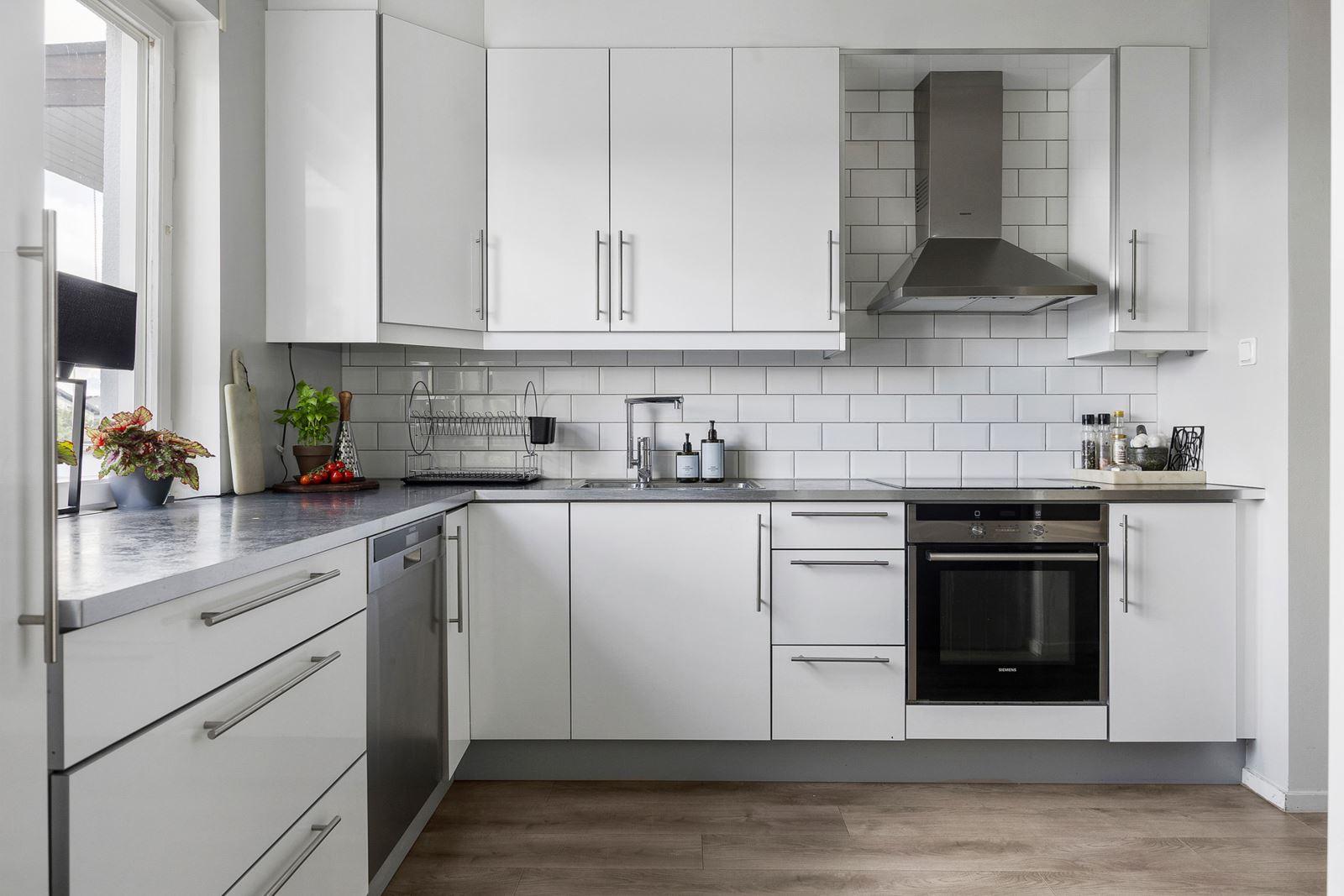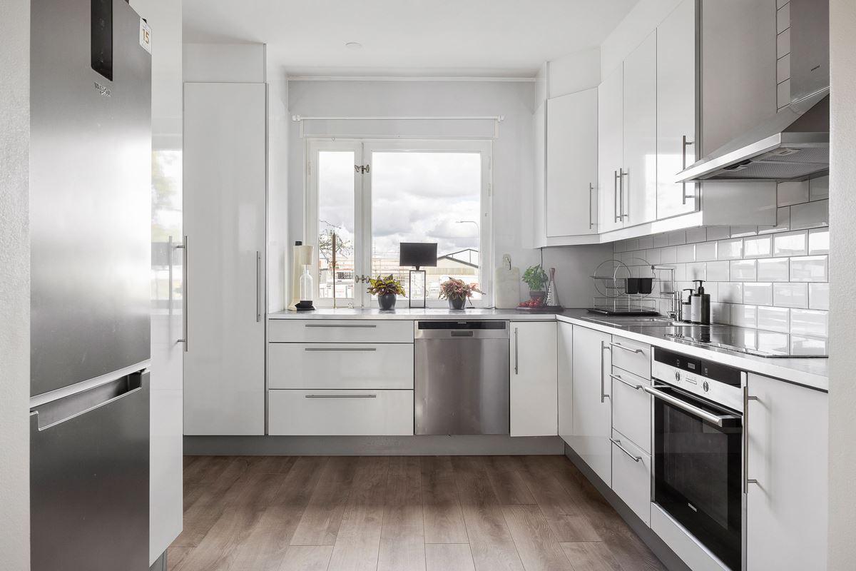 • Kök öppet mot vardagsrumPlatsbyggt kök med vita högblanka köksluckor (Vimmerbykök) samt laminatgolv. Utrustning: Kyl/frys -23 (Whirlpool), varmluftsugn (Siemens), induktionshäll (Siemens), fläkt, diskmaskin -25 (Elektrolux) samt mikro (Siemens). Samtliga vitvaror är från 2010, då köksinredningen sattes in.