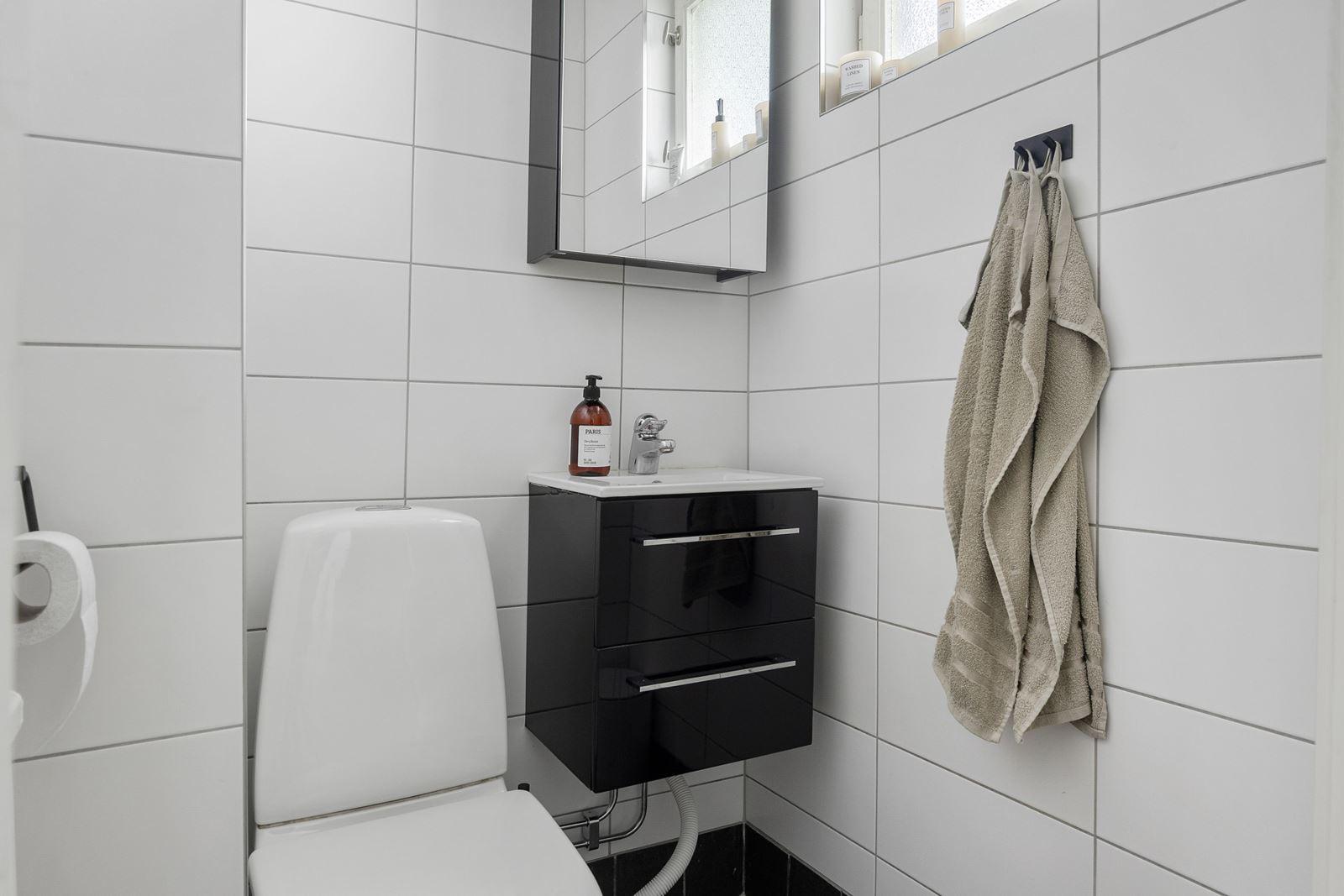 • Gäst-WcKlinkergolv med golvvärme och kaklade väggar. Utrustning: Toalett och handfat