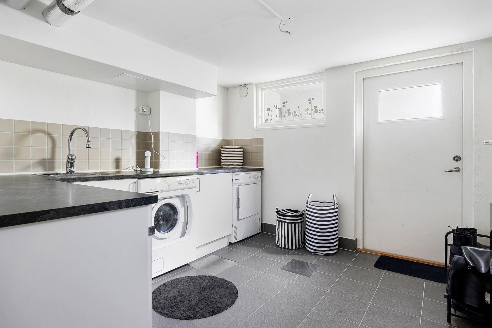 • Tvättstuga med utgång mot framsidanKlinkergolv, vit skåpsinredning. Utrustning: Tvättho, tvättmaskin -10 (Cylinda), torktumlare -10 (Cylinda)