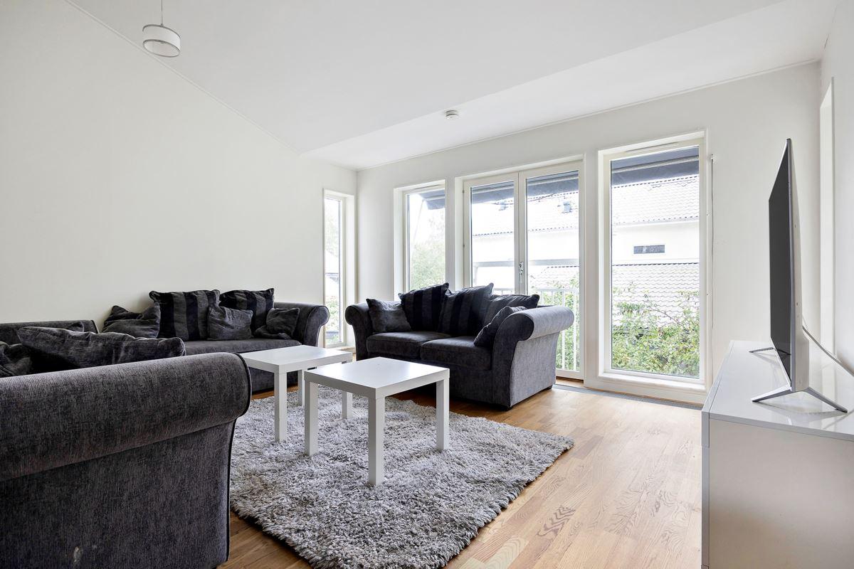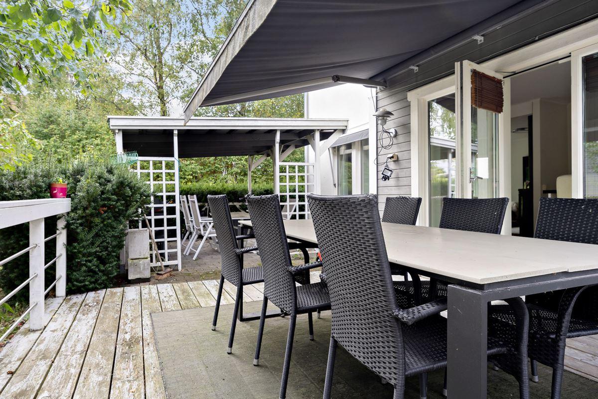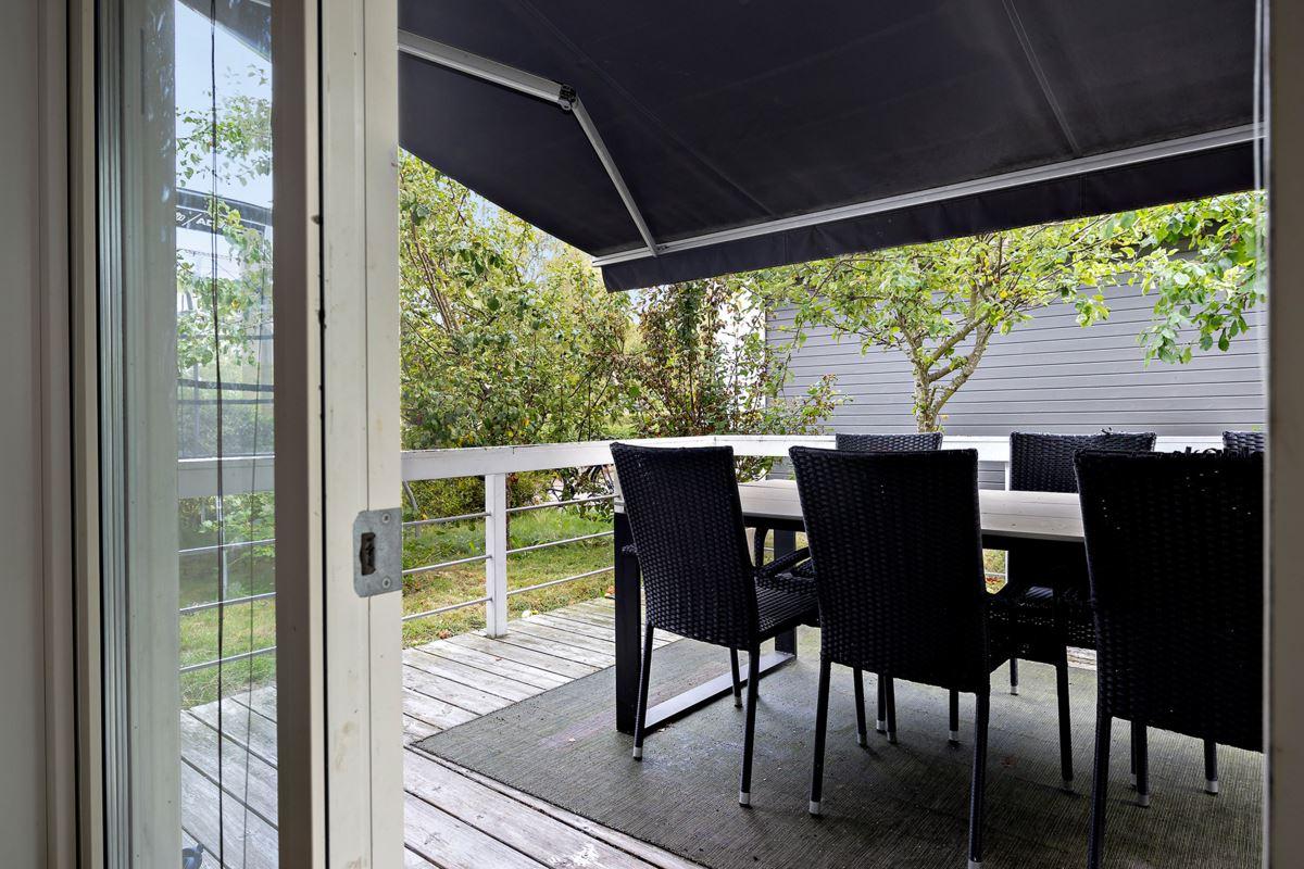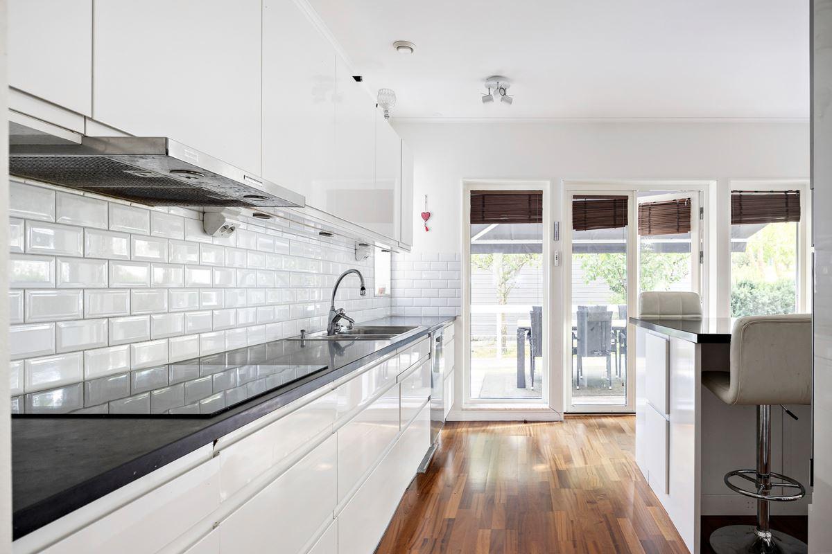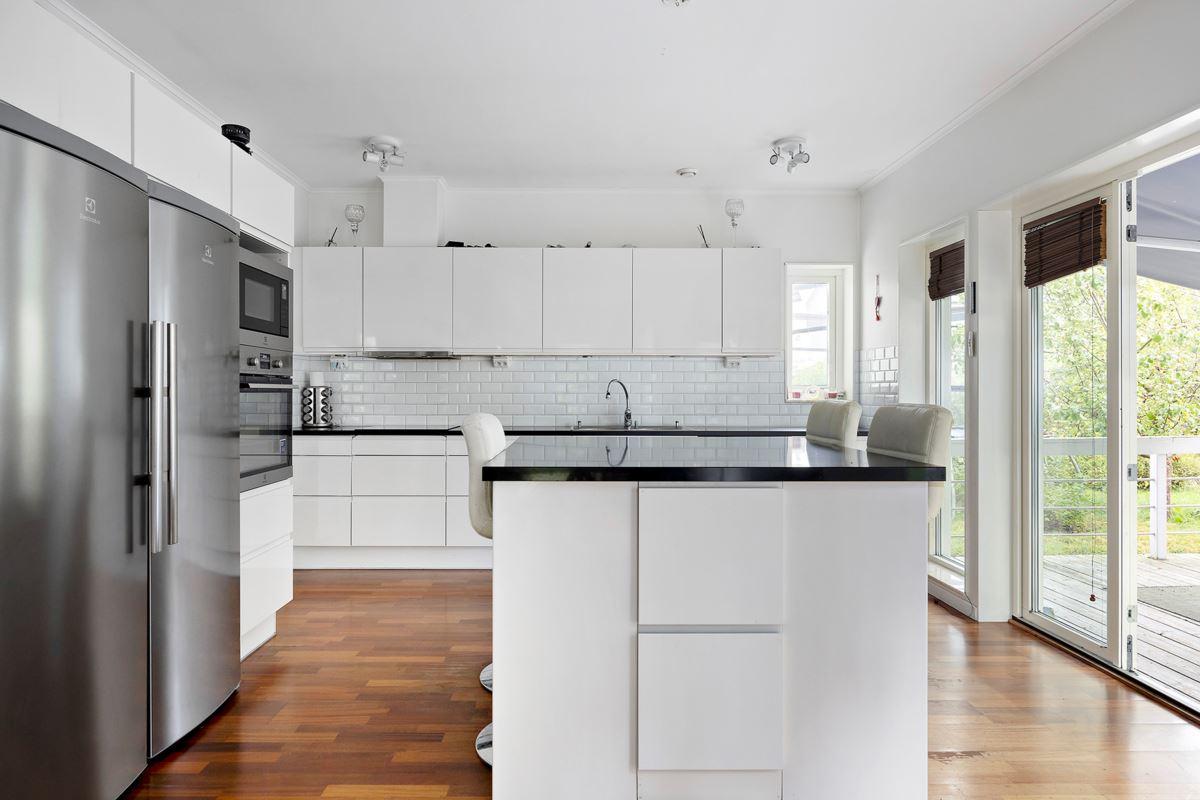 - Kök med köksö och utgång till uteplatsParkett i valnöt med vit köksinredning. Utrustning: Kyl, frys, varmluftsugn, induktionshäll, köksfläkt, diskmaskin, mikro samt granitbänkskiva. Samtliga vitvaror av märket Elektrolux