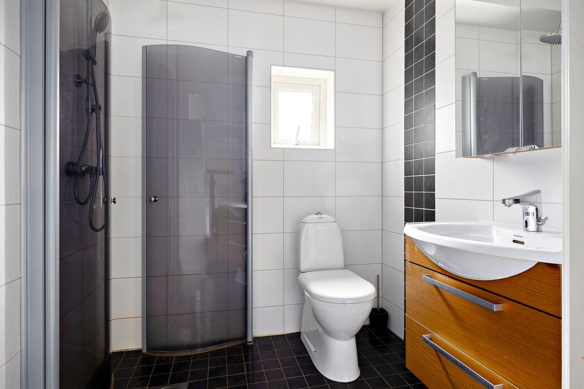 - DuschrumKakel och klnkergolv. Utrustning: Duschhörna med glasdörrar, toalett, kommod och badrumsspegel