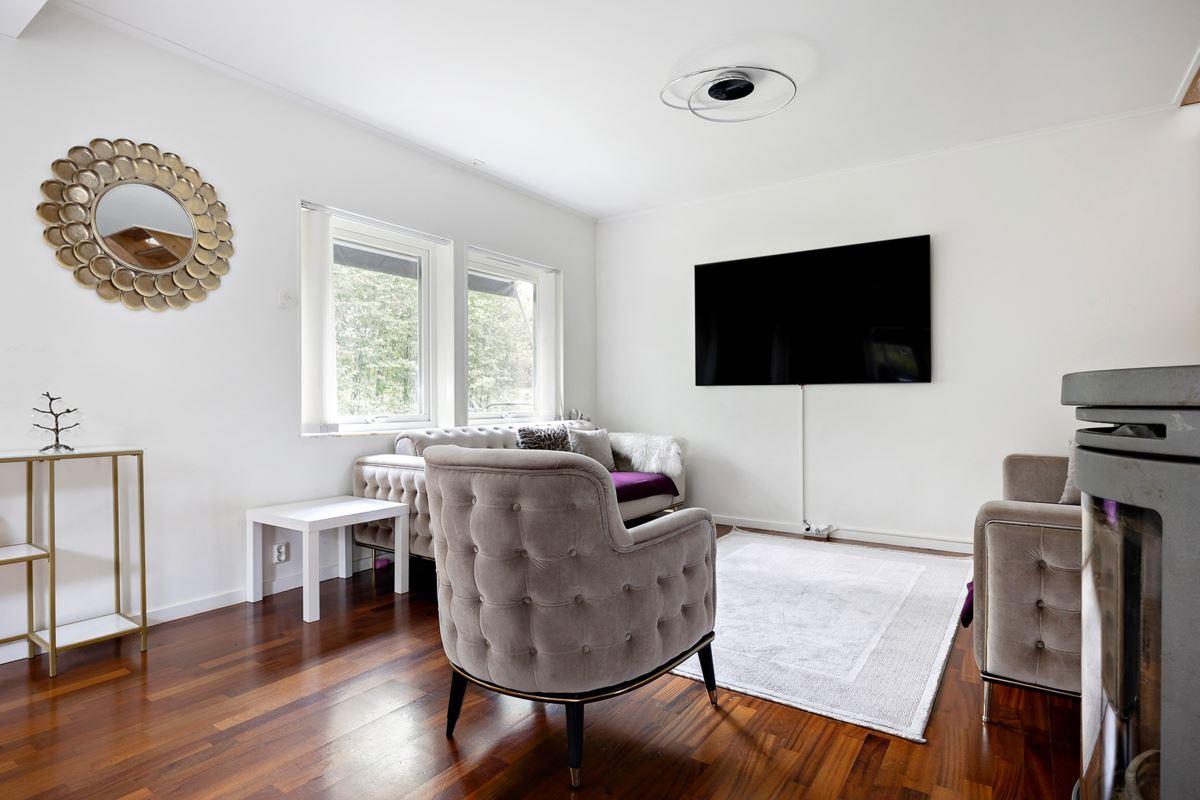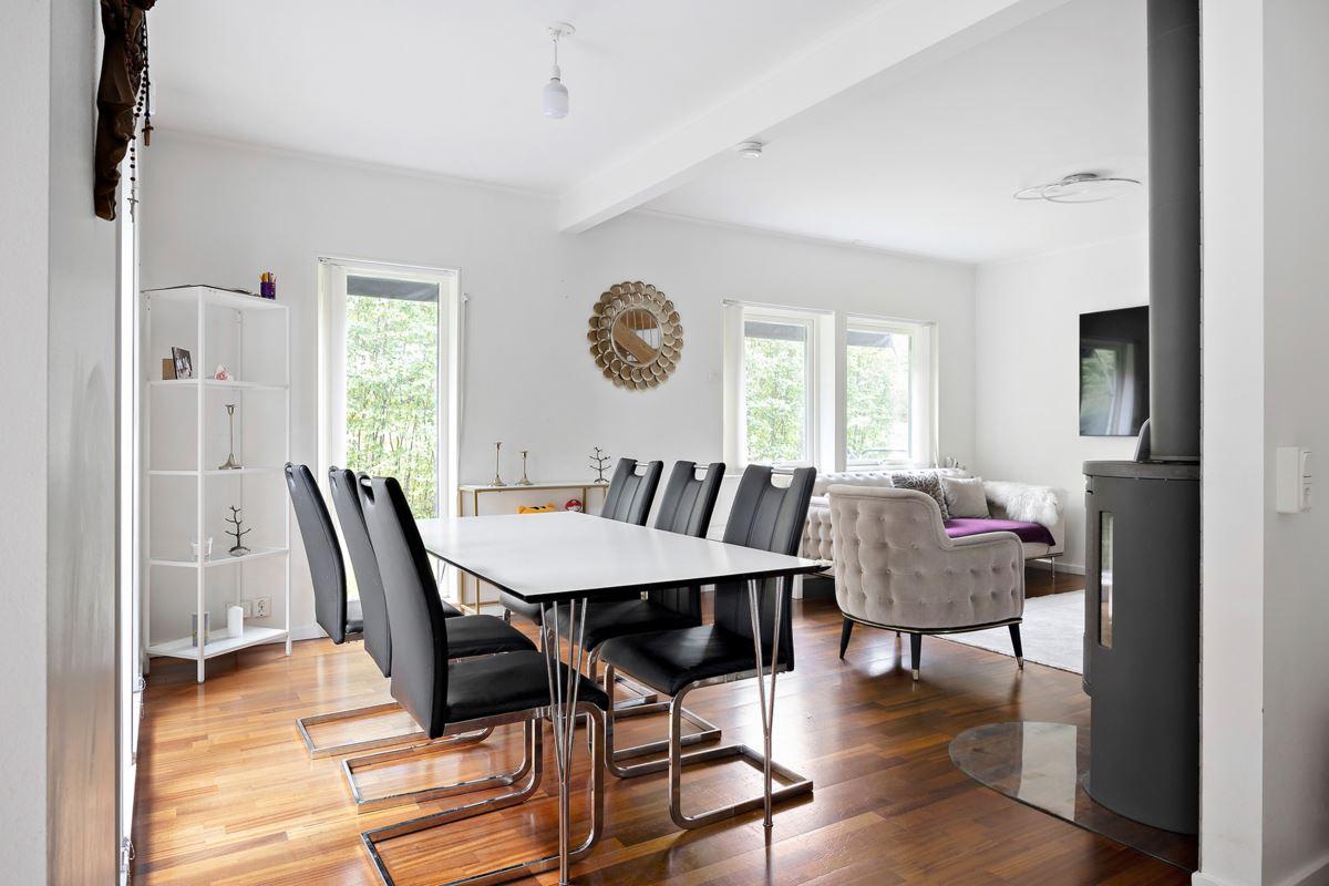 - Vardagsrum med matplats och braskaminParkett i valnöt