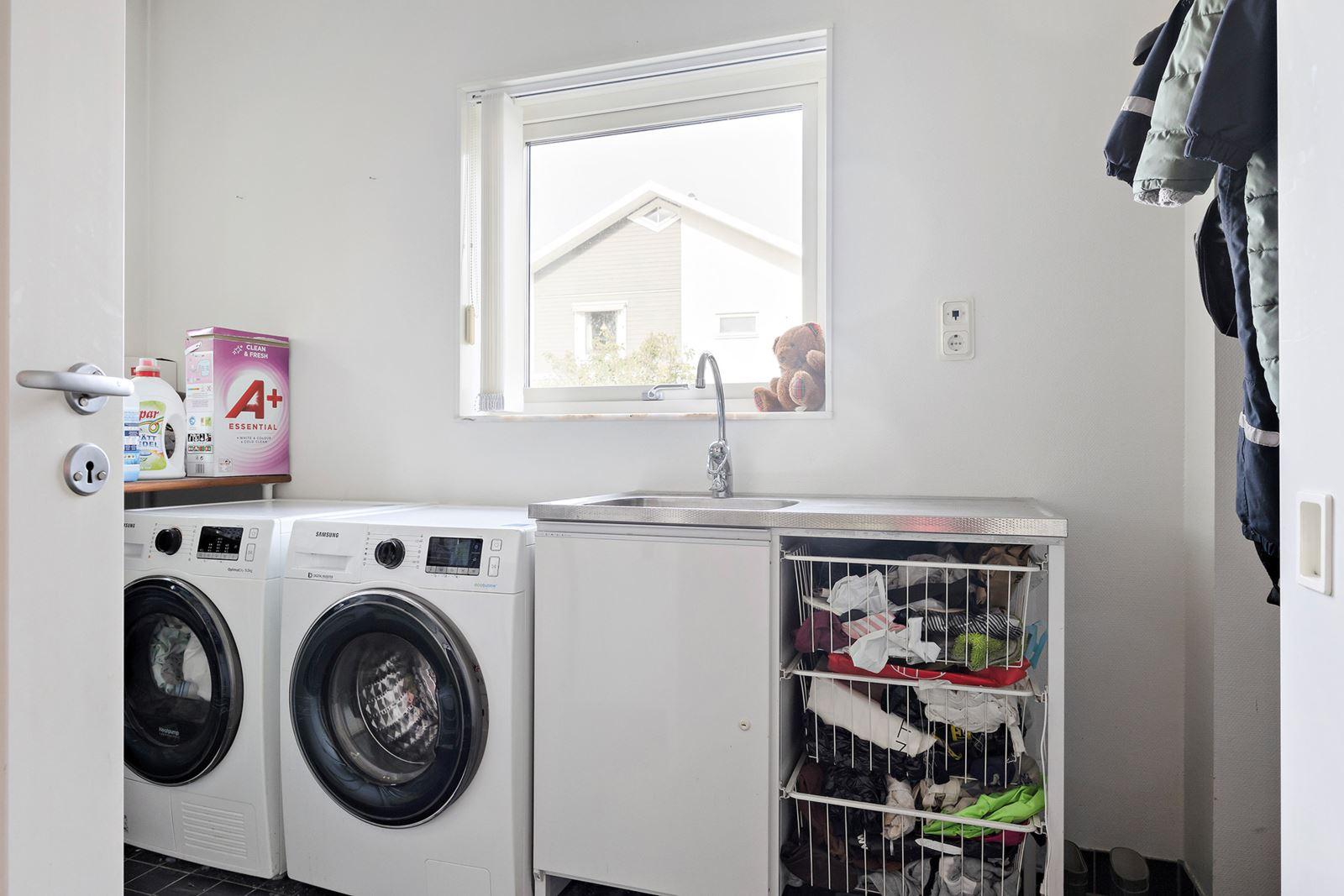 - TvättstugaKlinker på golv och våtrumstapet. Utrustning: Tvättmaskin, torktumlare, tvätthov och skåpsförvaring. Maskiner av märket Samsung.
