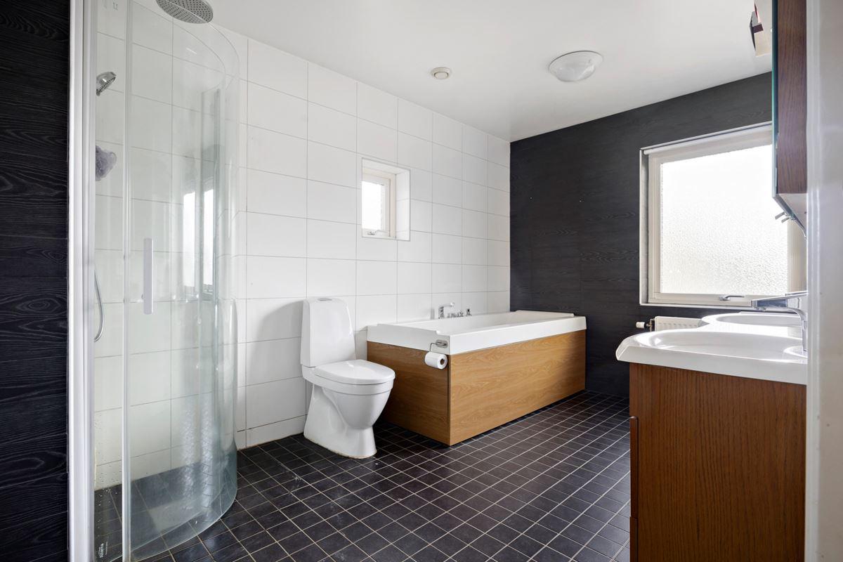 - Stort badrumKakel och klinkergolv. Utrustning: Duschhörna med glasdörrar, toalett, kommod, badkar, dubbla kommod och badrumsspegel