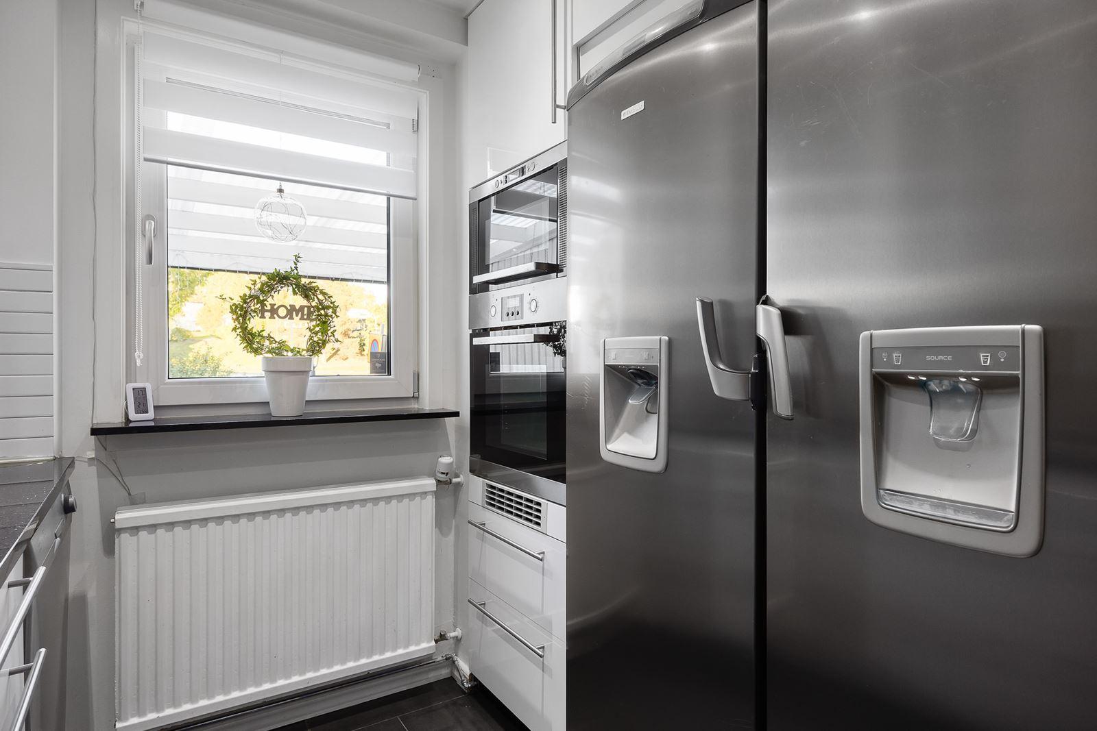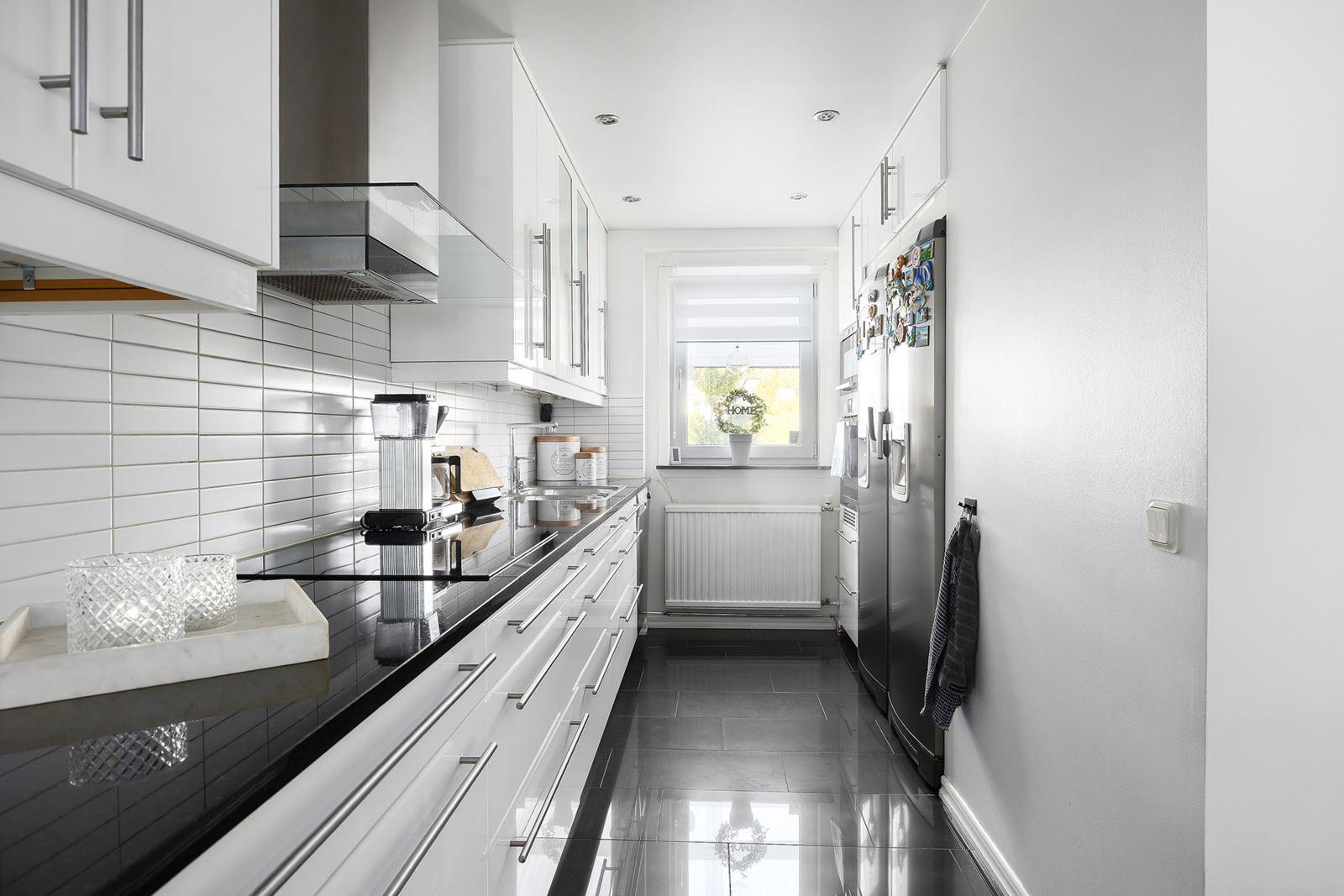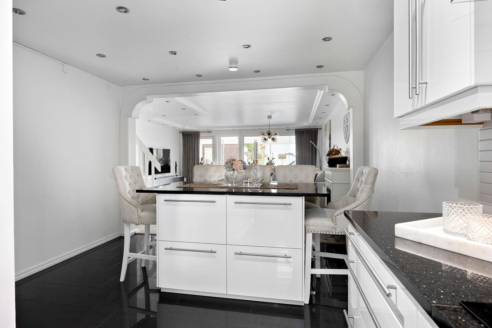 - Kök med matplats i köksöKlinkergolv med golvvärme (el) i svart högblankt. Utrustning: Kyl endast vattenfunktion, frys, varmluftsugn, mikro, köksfläkt, induktionshäll samt diskmaskin. Granitbänkskiva i kök och köksö.