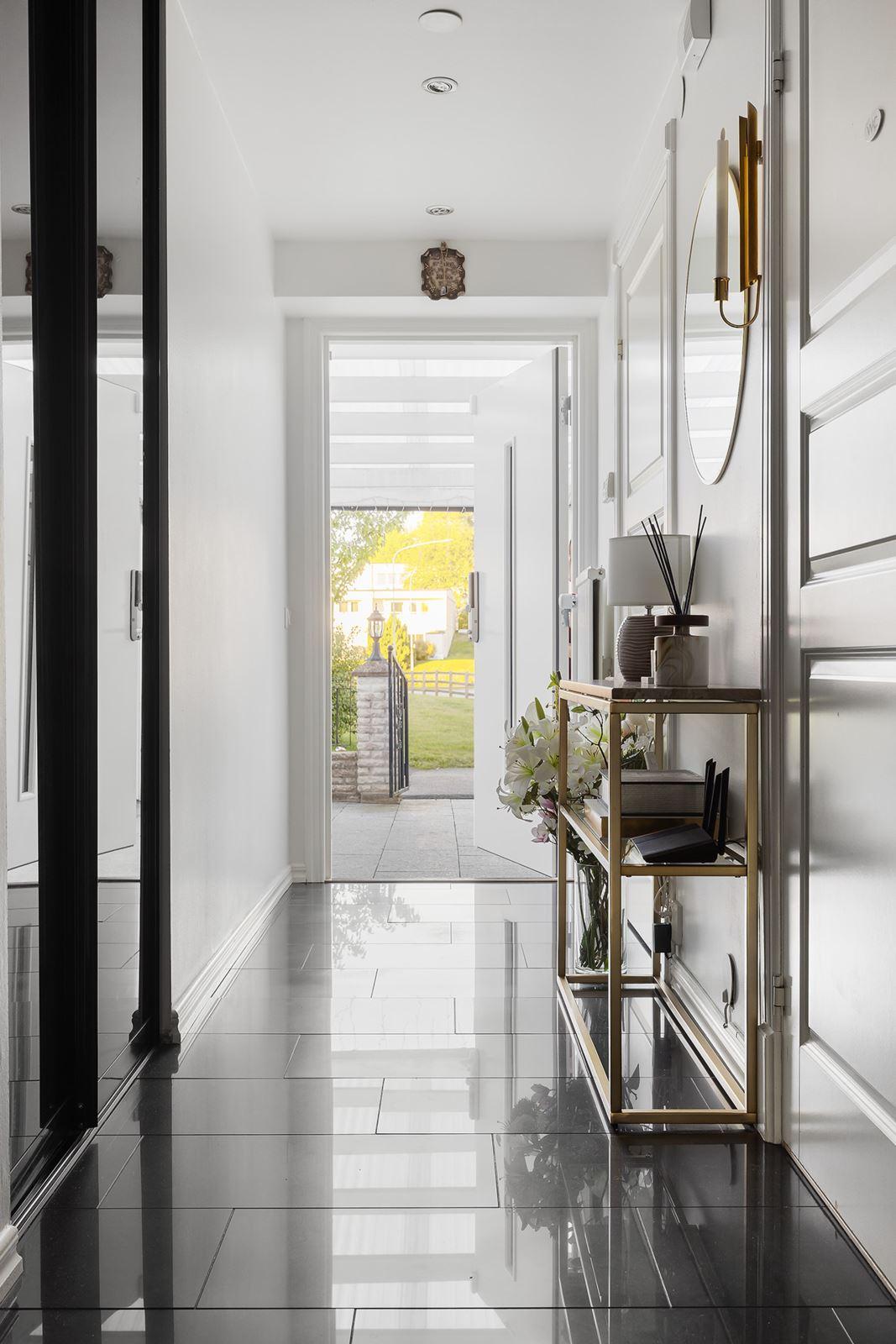 - Hall med avhägningsdelKlinkergolv med golvvärme (el) i svart högblank och skjutbar garderob