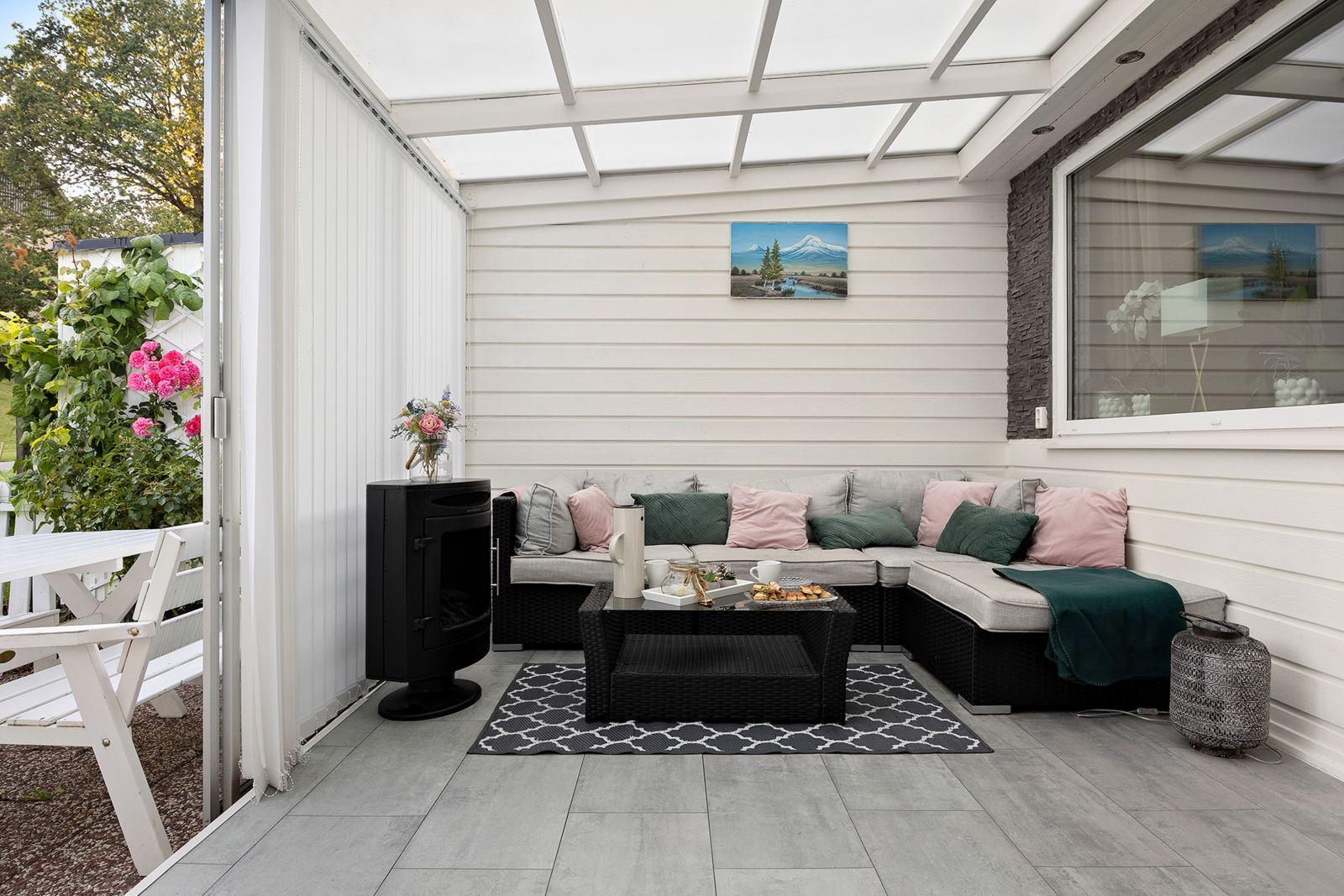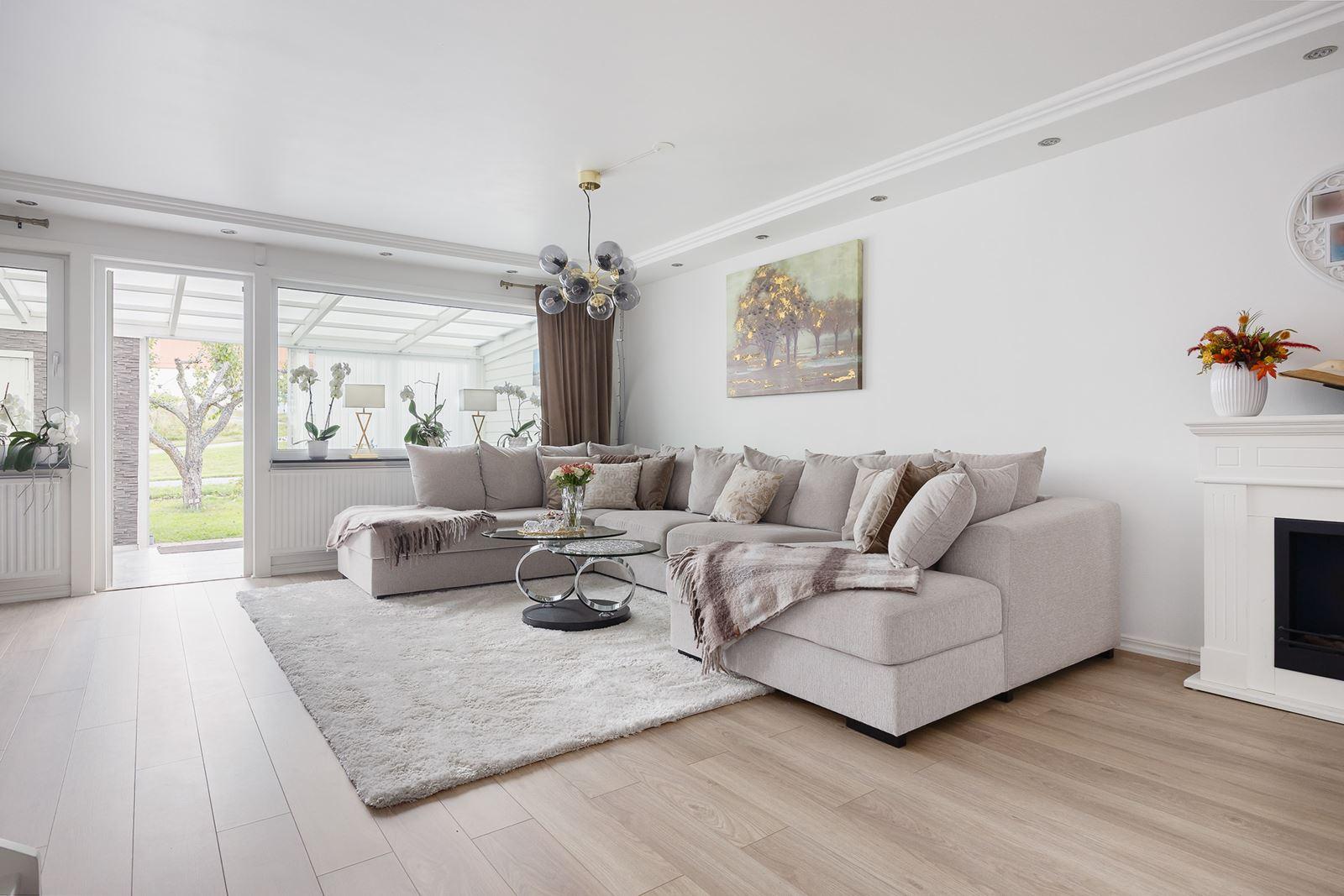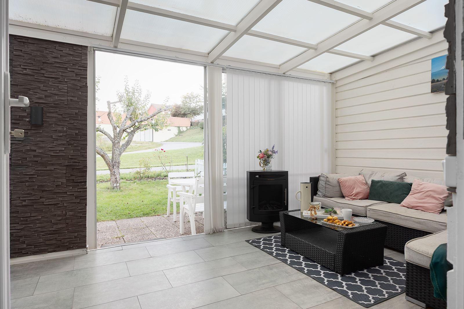 - Vardagsrum med utgång till inglasad altanExklusiv vinylgolv