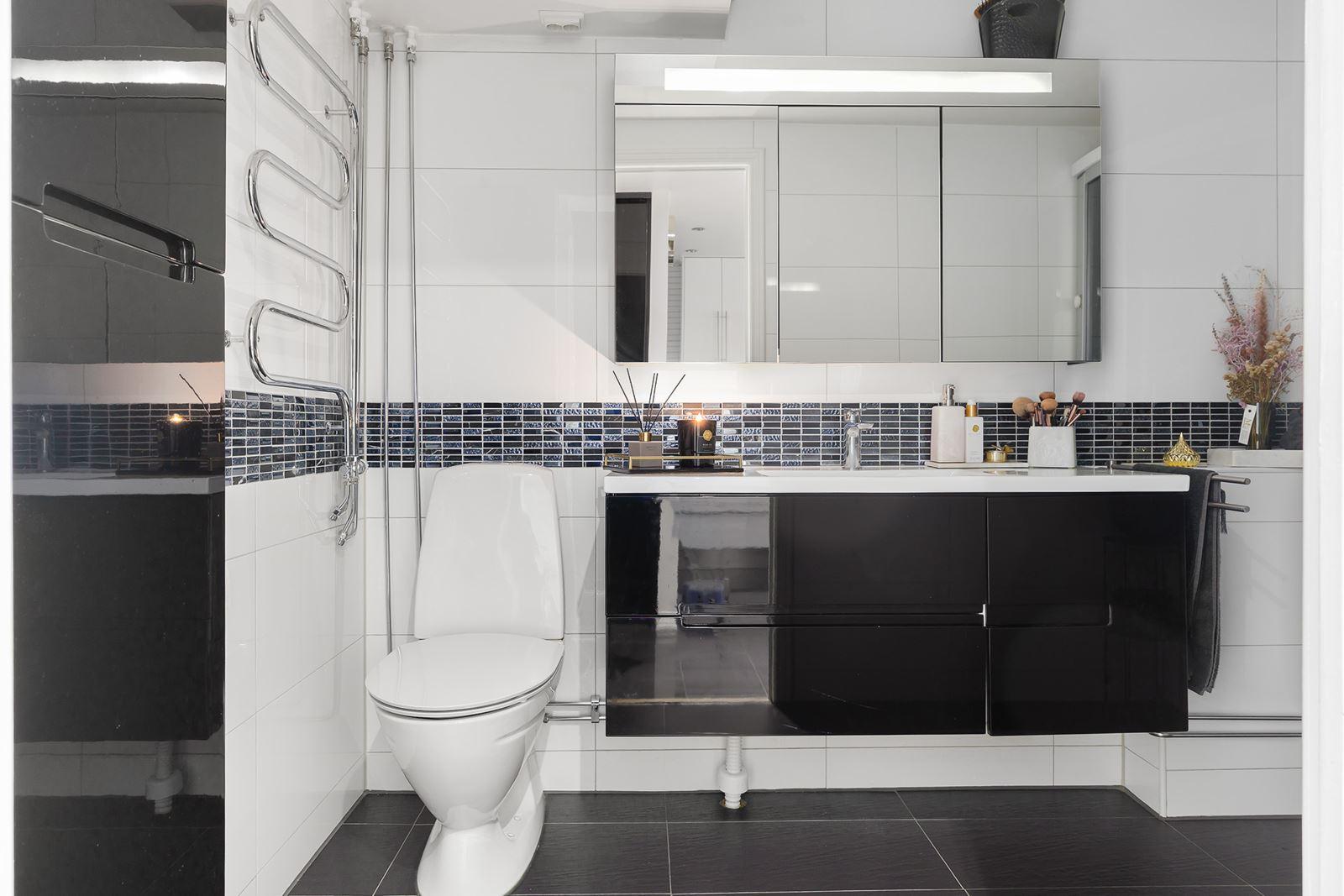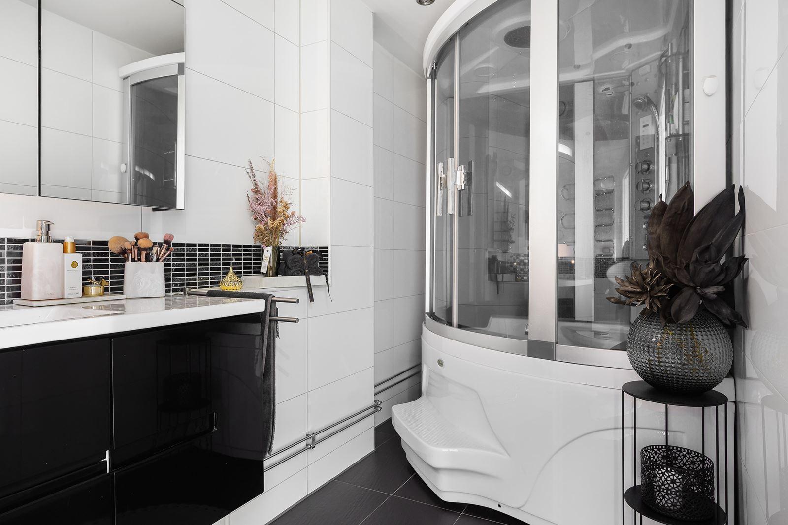 - Stort badrumKakel och klinkergolv med golvvärme (el) i svart högblank. Utrustning: Toalett, stor kommod, handdukstork, badrumsspegel, duschkabin med ång -och multifuntion och sittplatser
