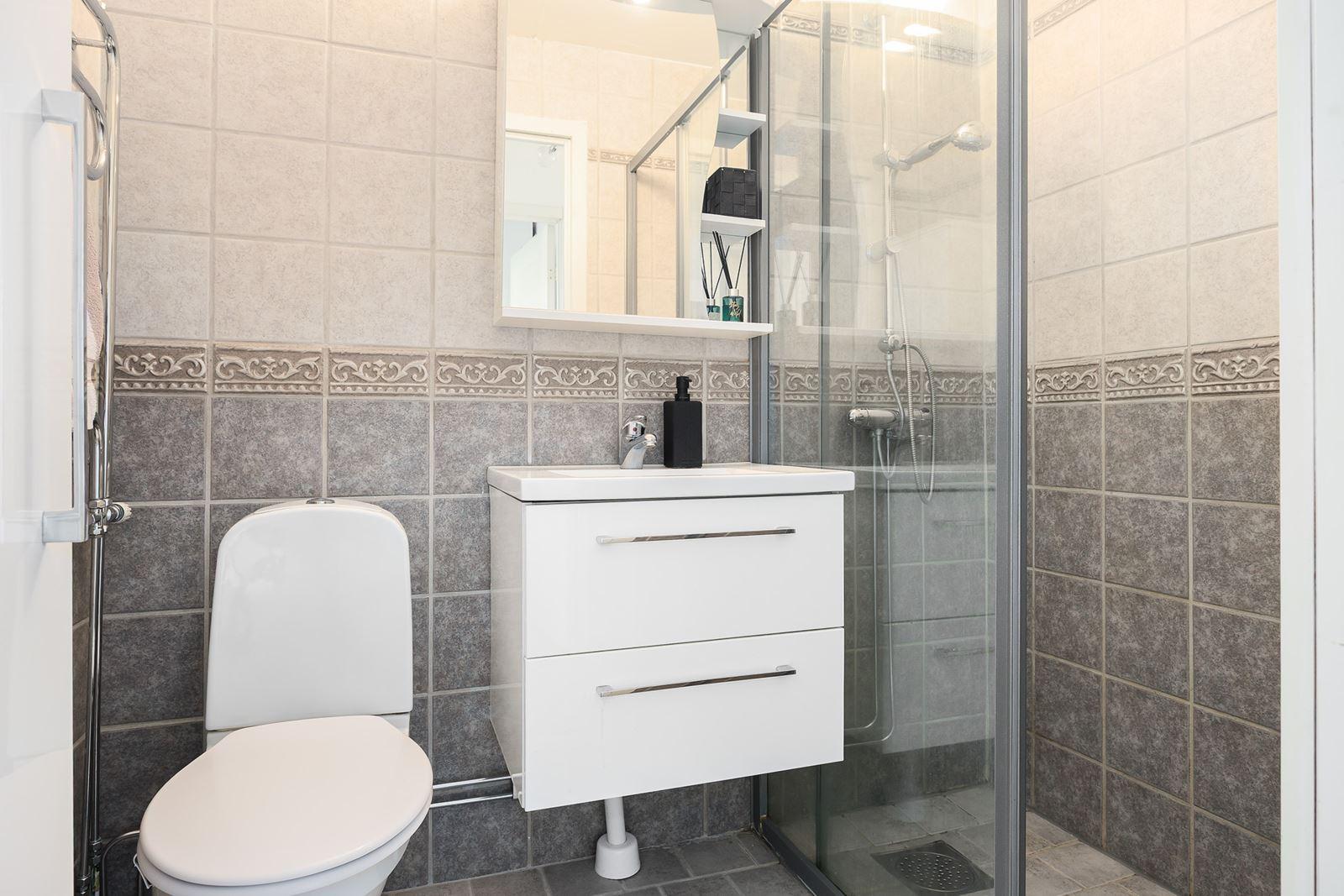 - DuschrumKakel och klinker. Utrusning: Toalett, kommod, badrumsspegel, duschhörna med skjutbara glasdörrar och handdukstork.