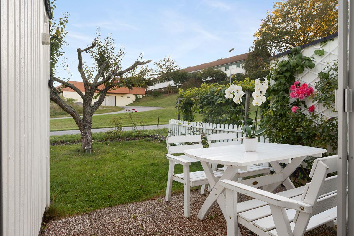- Övrigt tomtLättskött mindre trädgårdstomt med smidesstaket på framsidan
