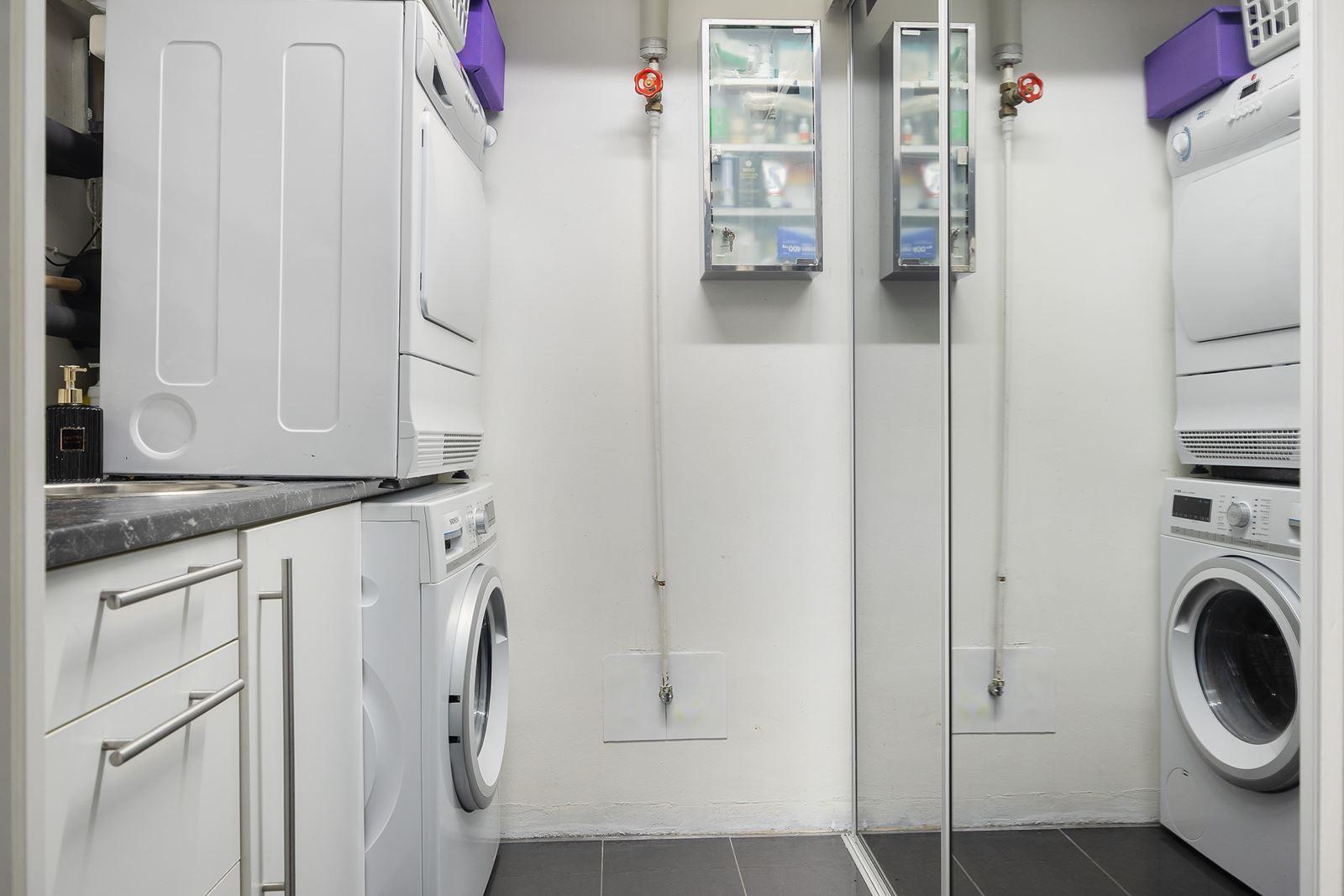 - TvättstugaKlinkergolv med golvvärme (el). Utrustning: Tvättmaskin, torktumlare, tvättho, skåpsförvaring och skjutbar garderob